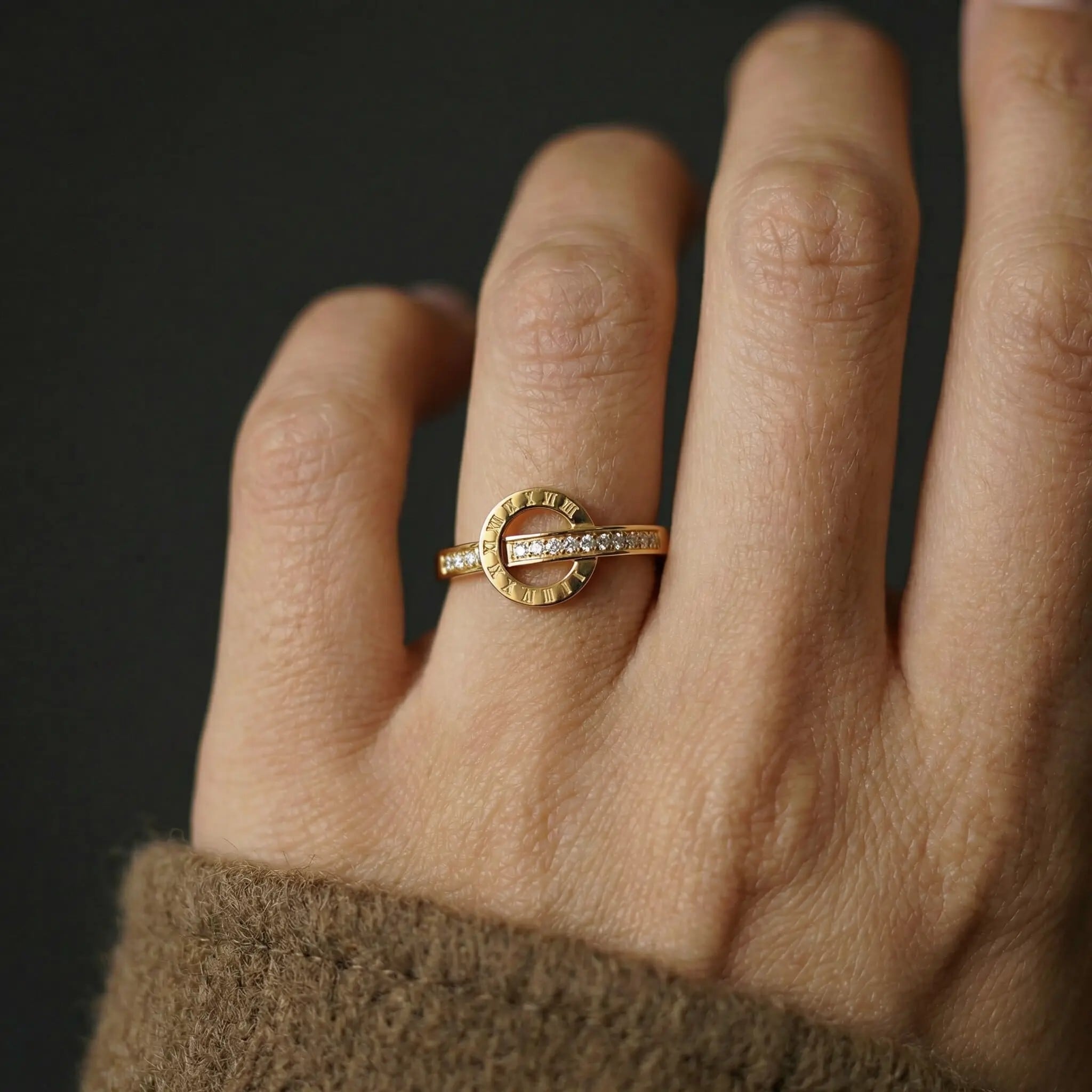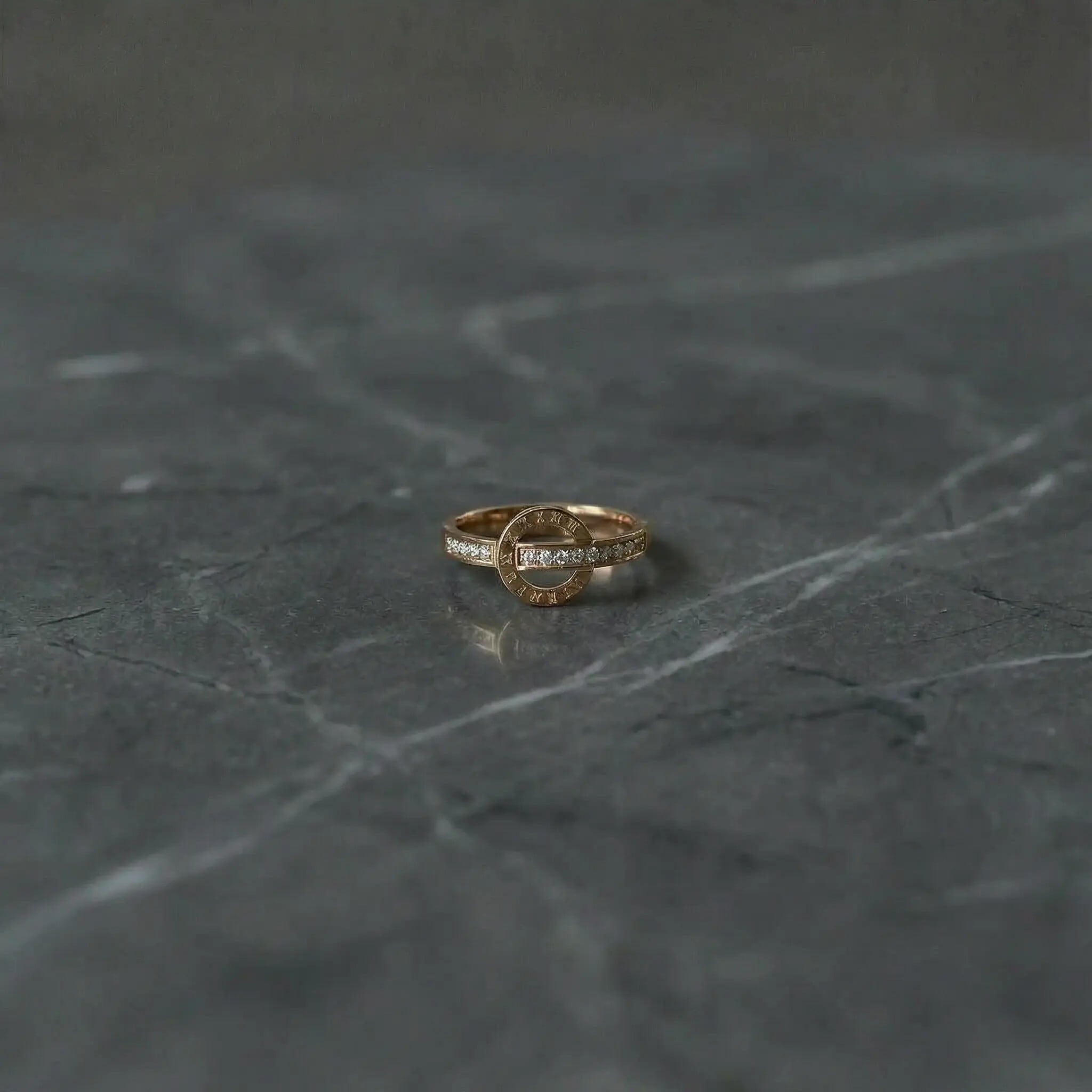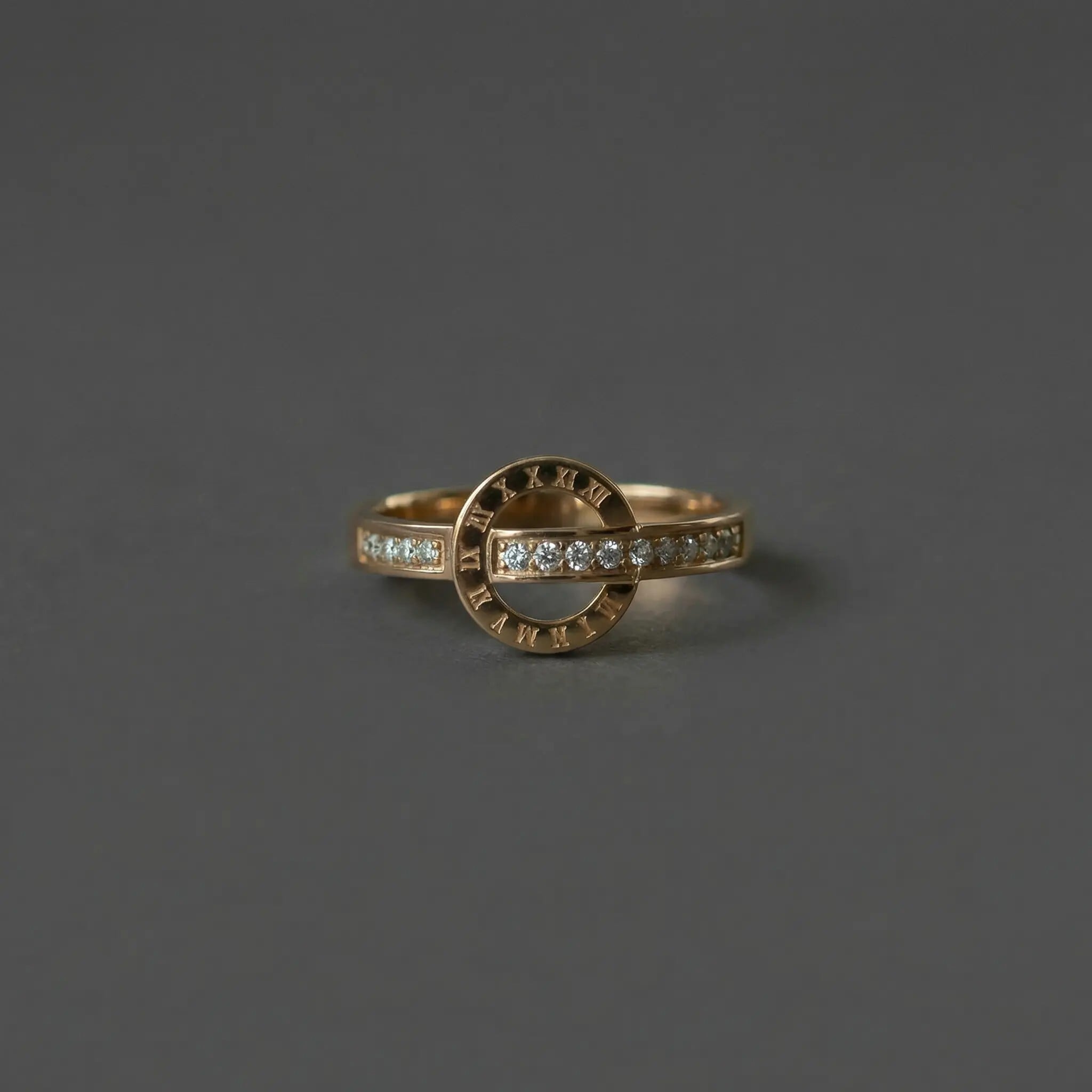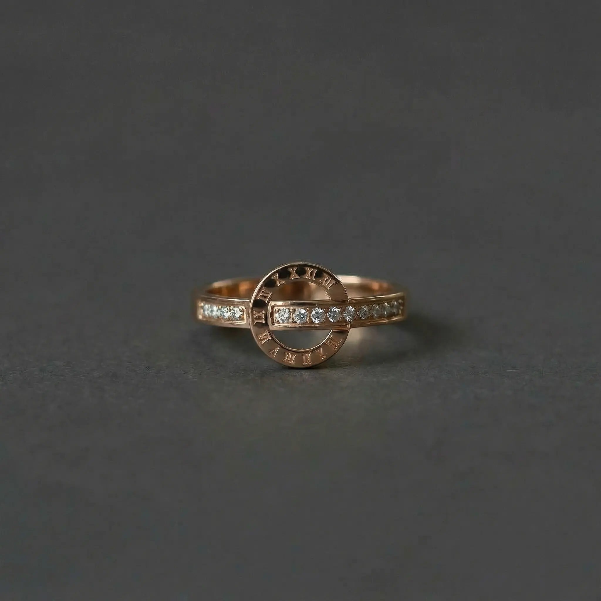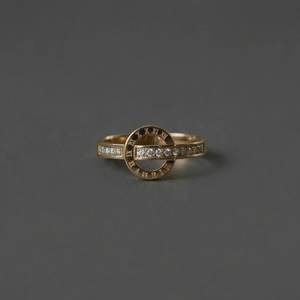繊細に刻まれたローマ数字と、零れんばかりのジルコニアが輝く、洗練されたデザインリングです。