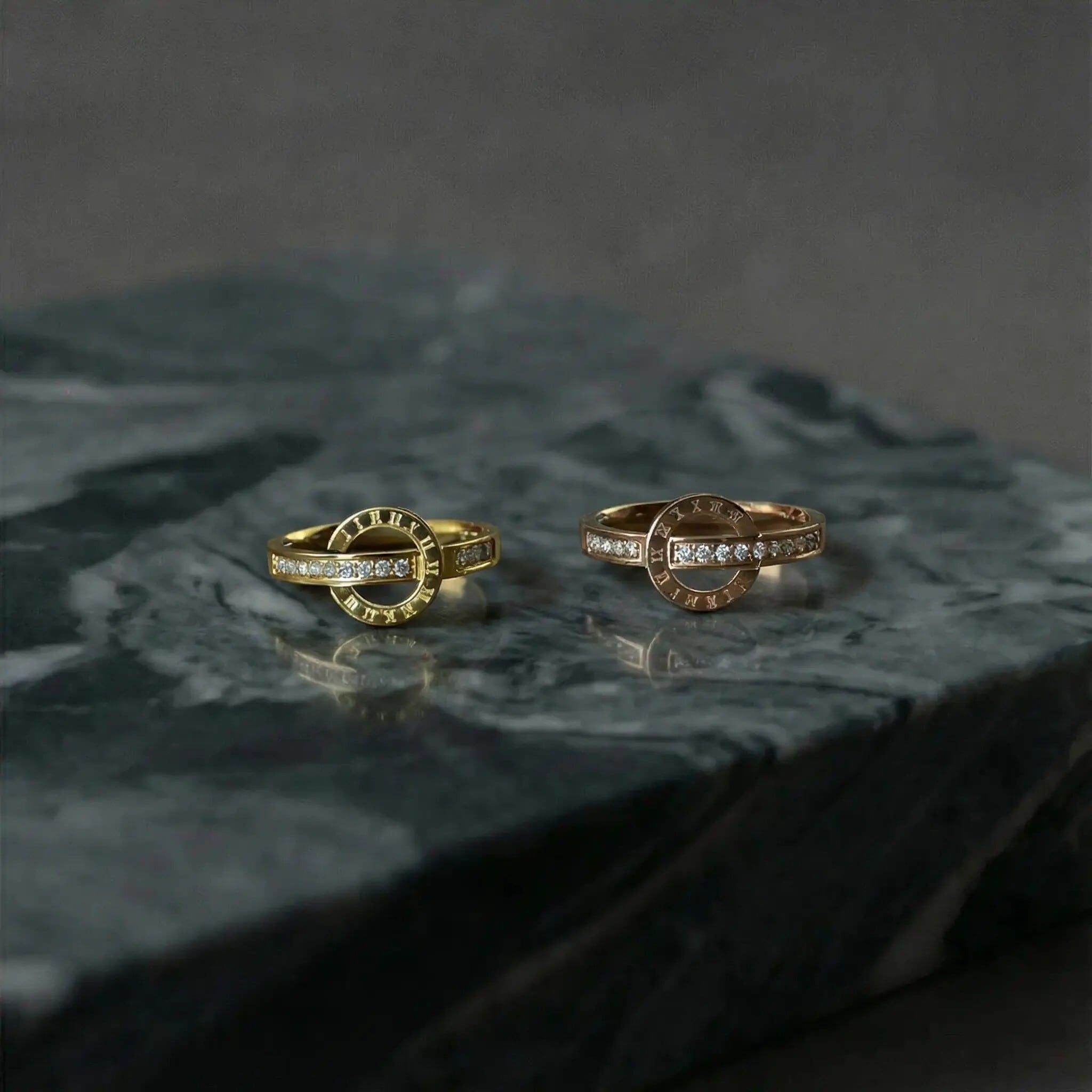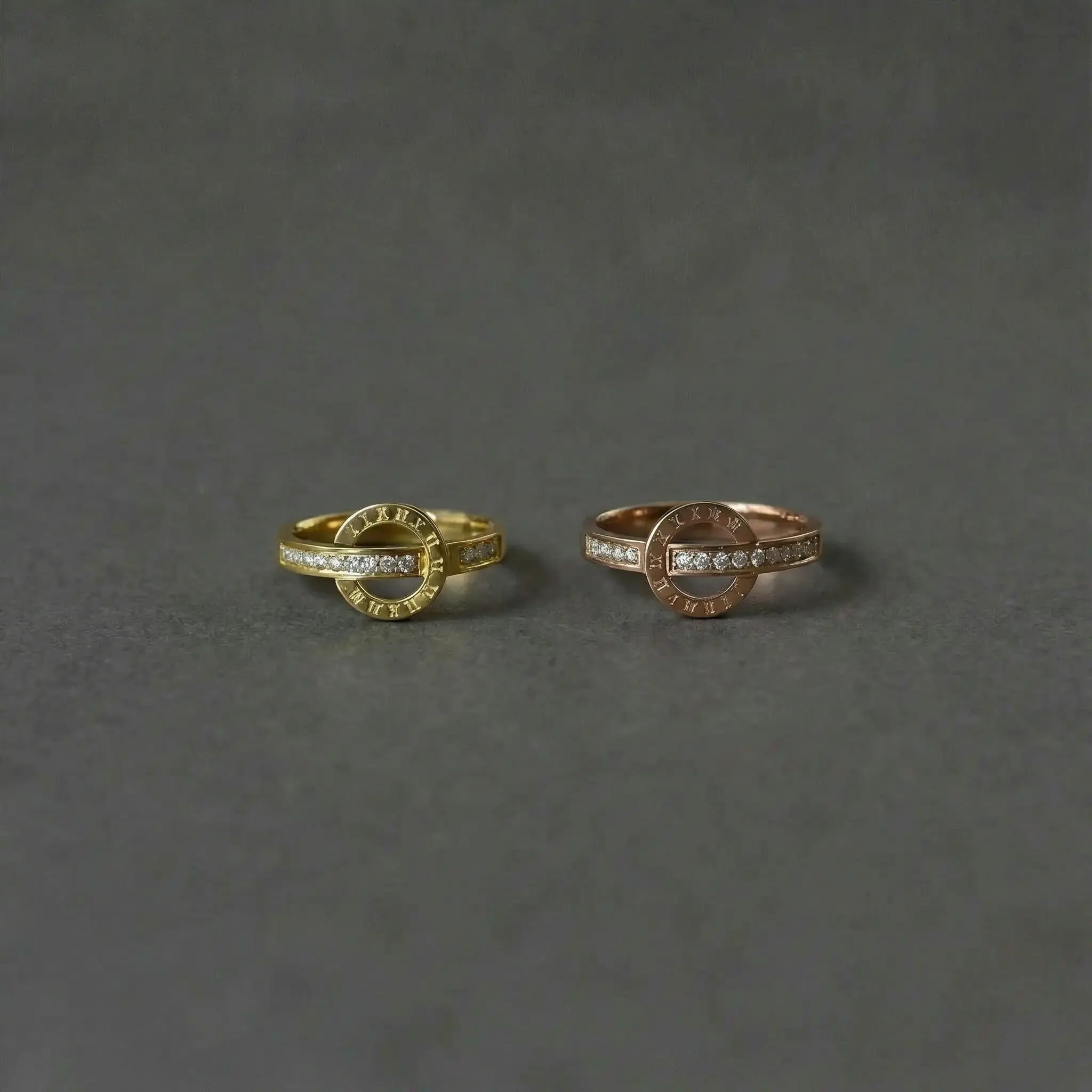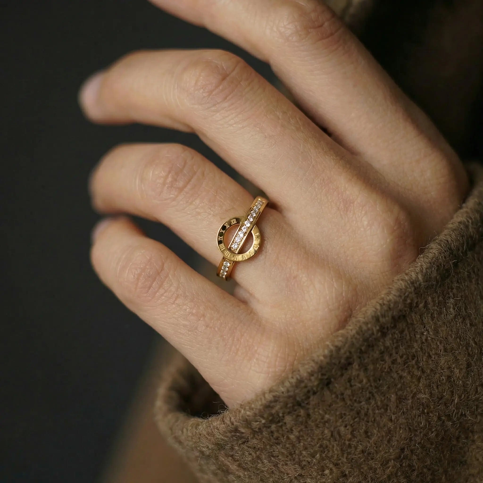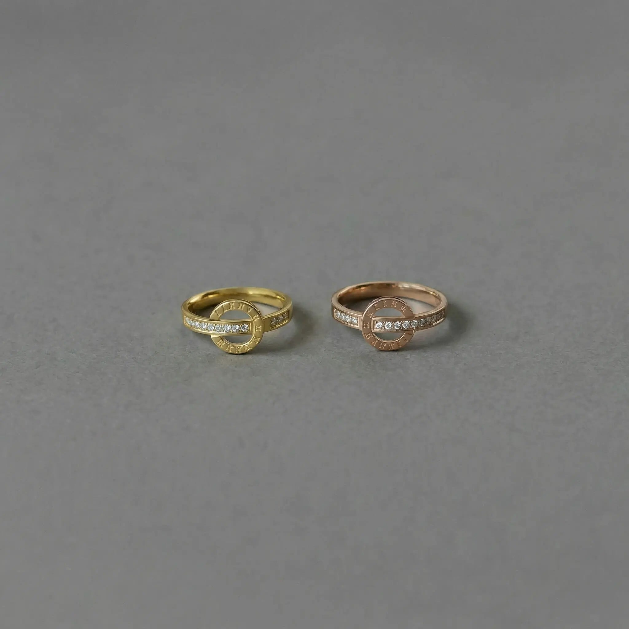 繊細に刻まれたローマ数字と、零れんばかりのジルコニアが輝く、洗練されたデザインリングです。