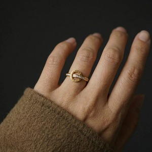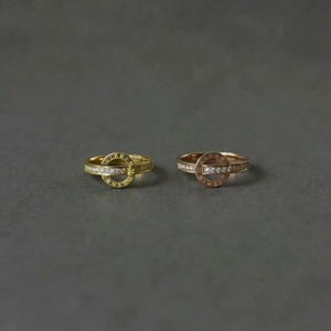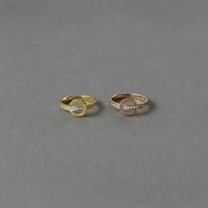円形モチーフを横切るバーと、リングのサイドにセットされたストーンが、どの角度から見ても華やかな表情を演出します。