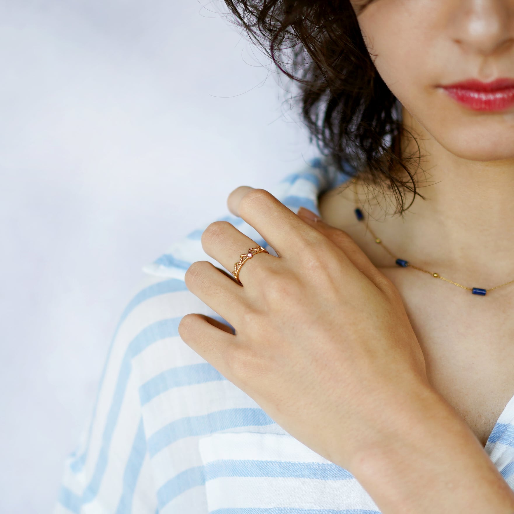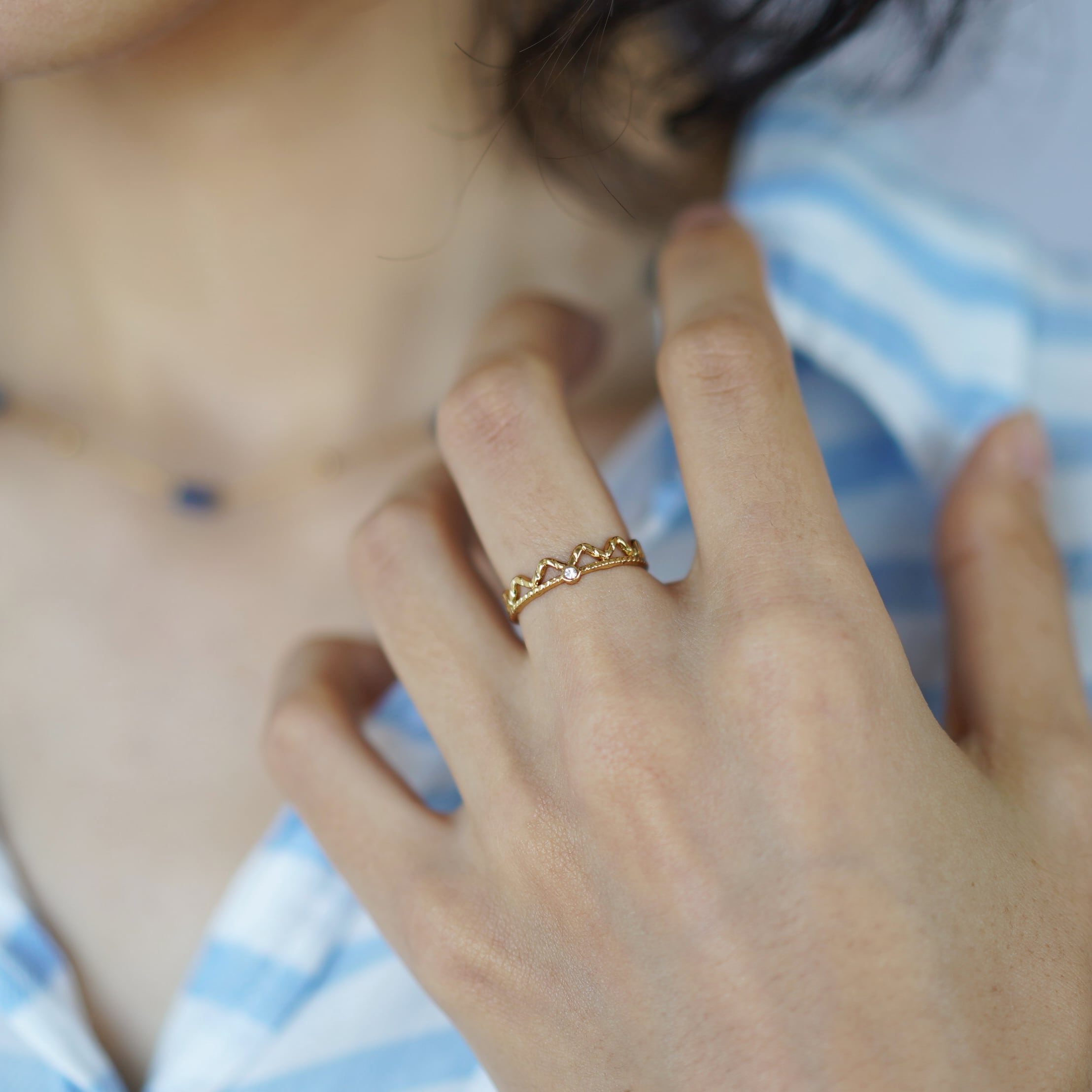 リング全体にわたり、小さな三角形のモチーフが連続して連なることで、レースのような可憐で軽やかな印象を生み出しています。