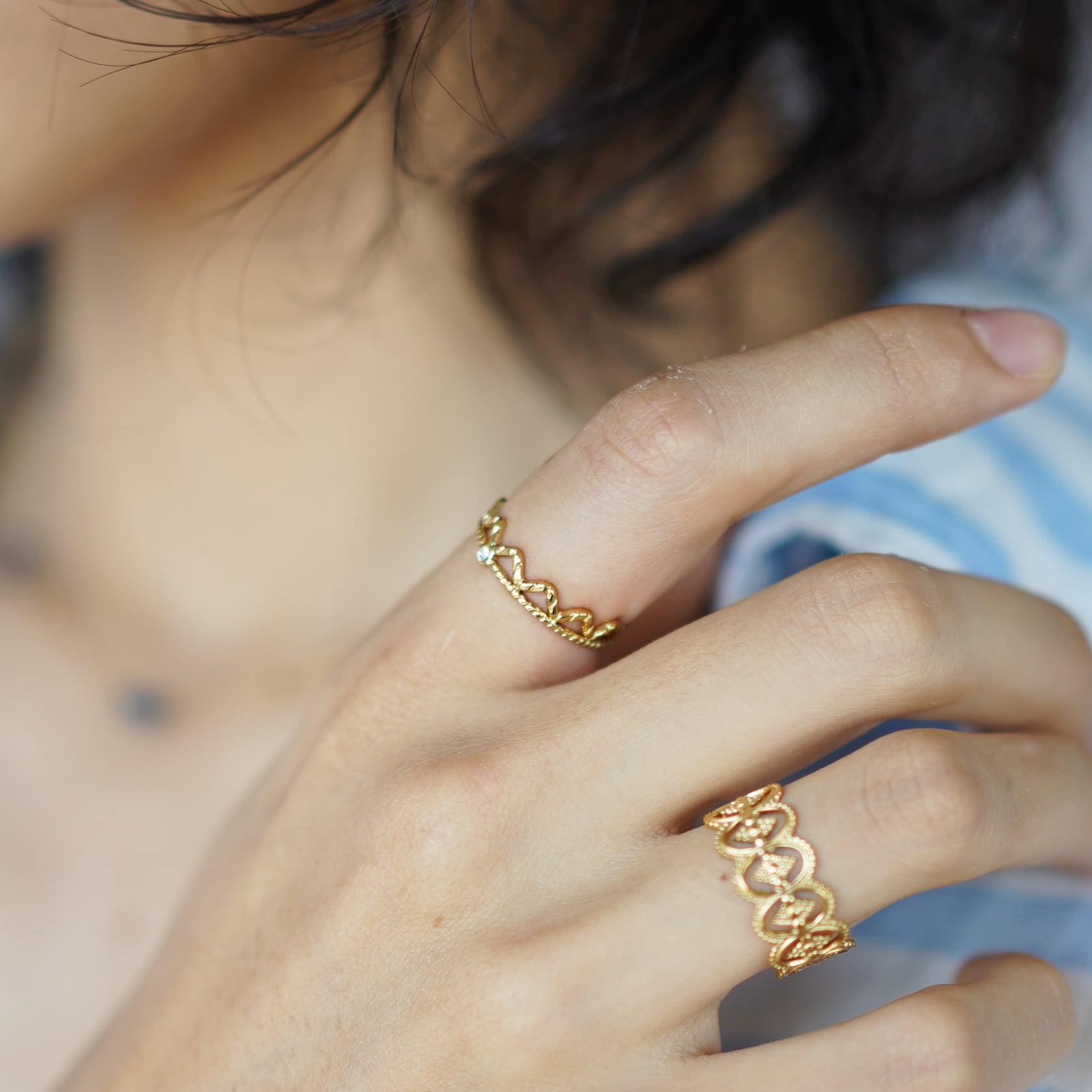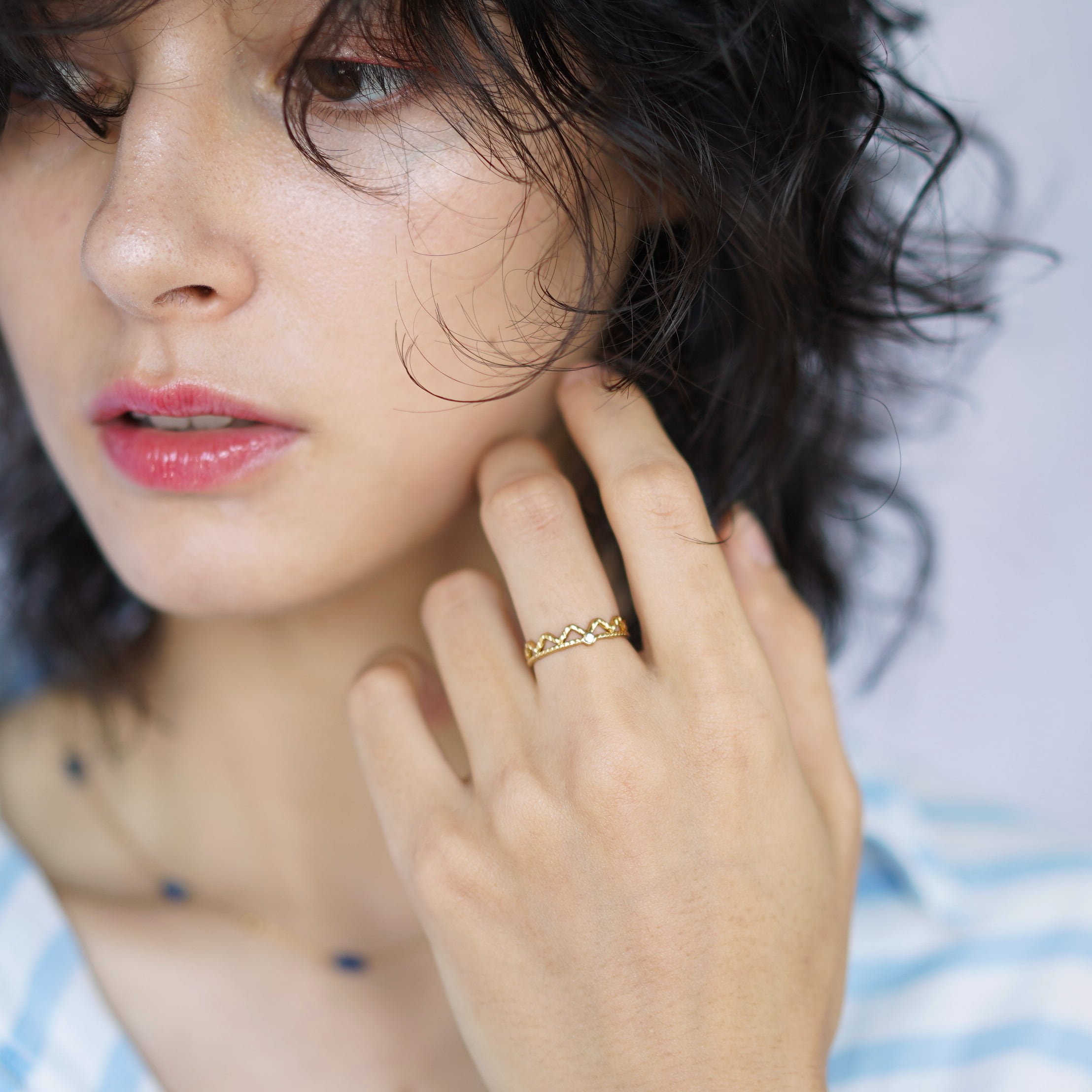 華奢なフォルムは指を細く長く見せる効果があり、単体で着用するだけで手元を優雅に彩ります。また、その細さから、シンプルなソリテールリングや他の地金リングとの重ね付けにも最適です。
