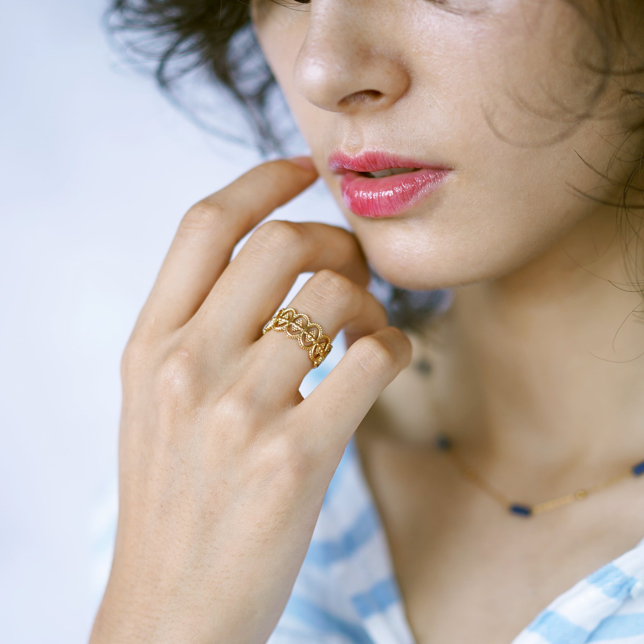 デザインは、中央にひし形が連なるようなモチーフを配し、上下を波打つラインで挟み込んだような、クラシカルでエレガントな造形です。この繊細な構造により、光が透けて肌色と調和し、指元に上品な華やかさをもたらします。