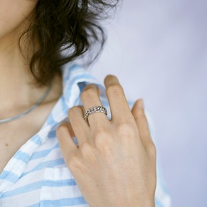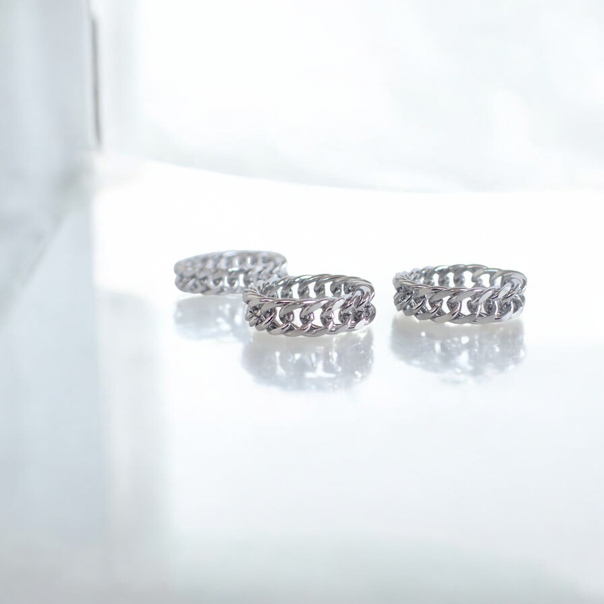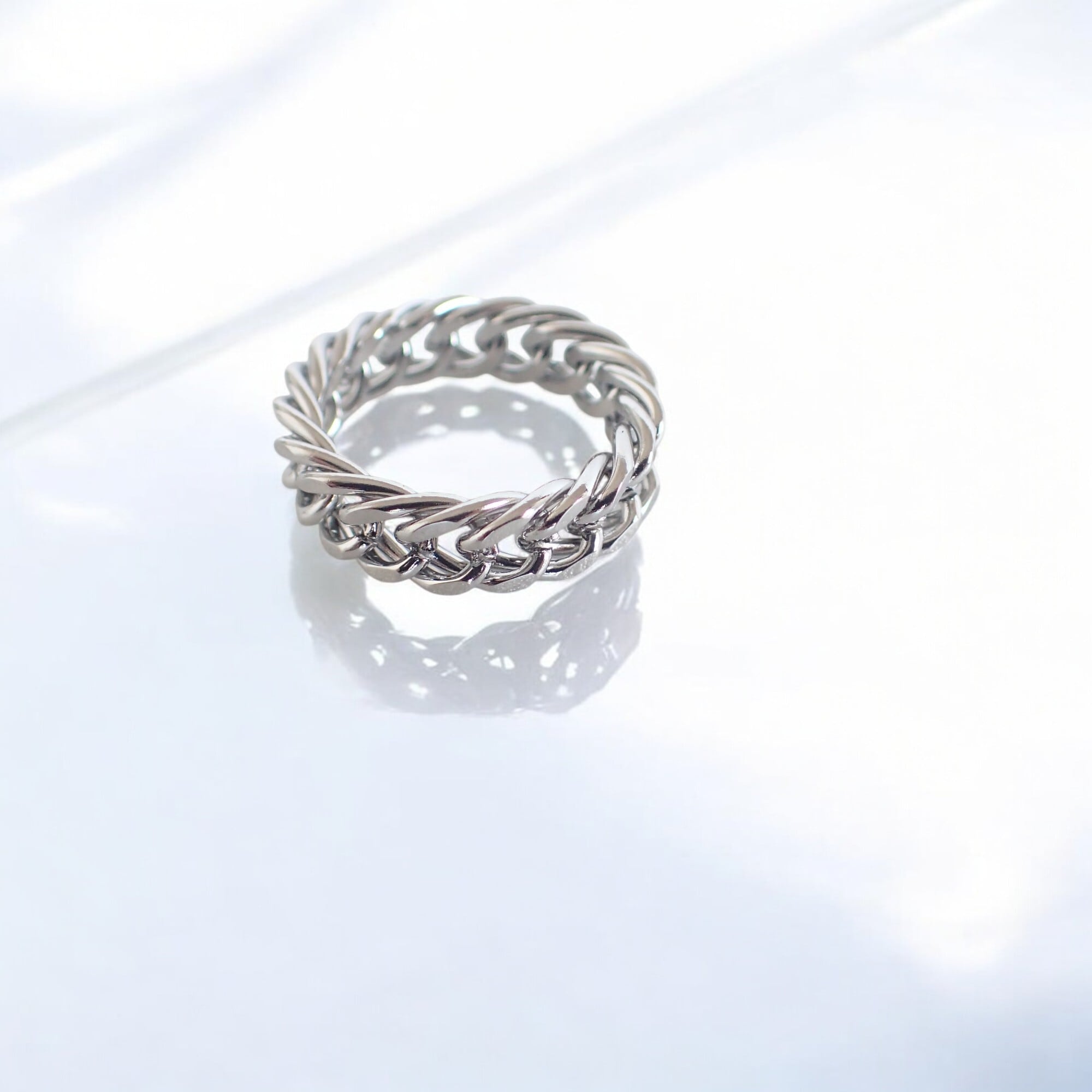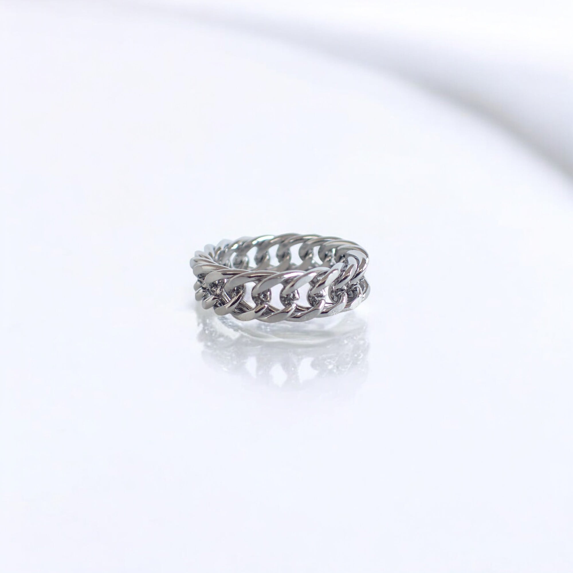 複数のチェーンリンクが連なり、リング全体を構成するソリッドなチェーンデザインが特徴です。各リンクがしっかりと組み合わさることで、幅広で安定感のあるフォルムを実現しています。