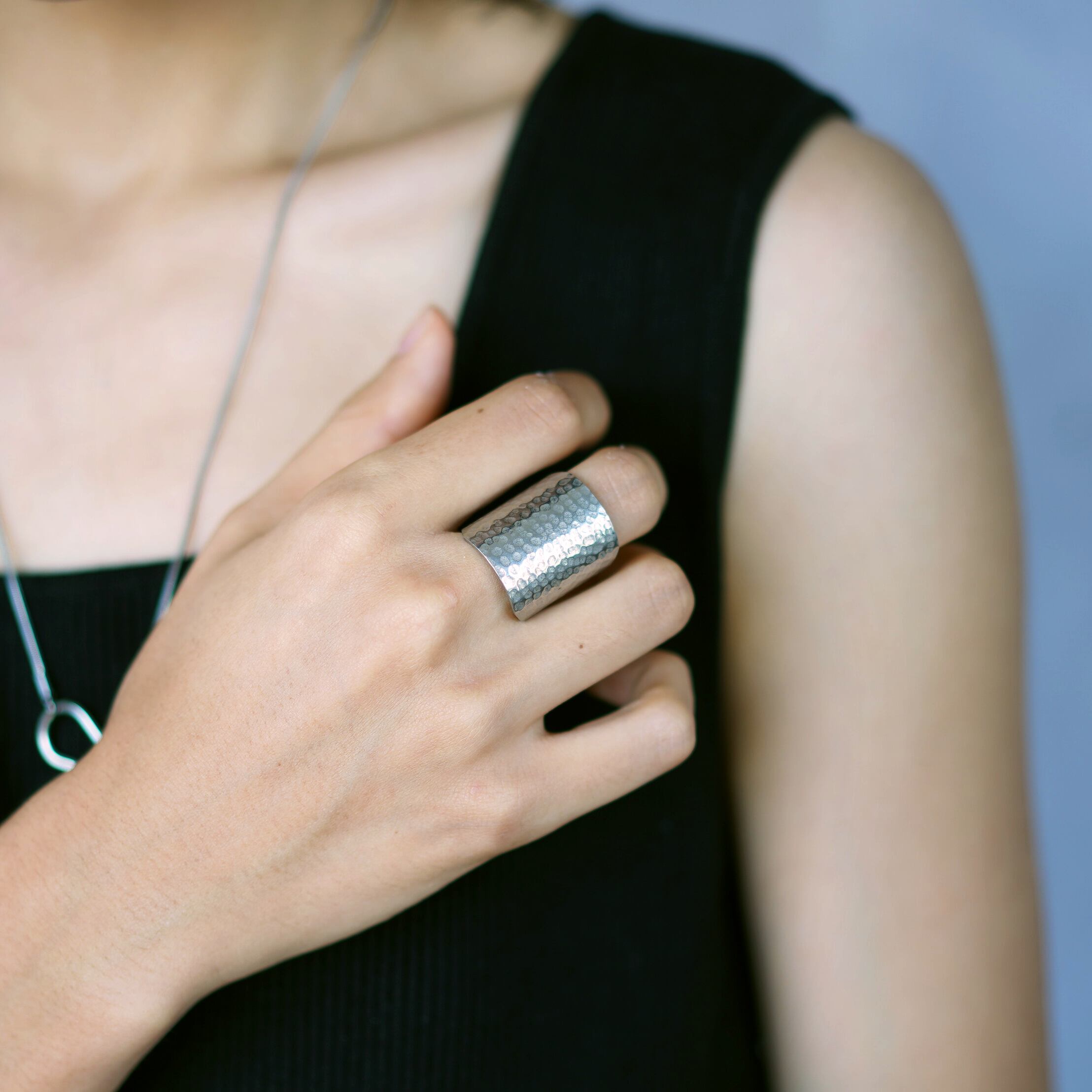 クールなシルバーカラーの表面全体には、光を複雑に反射するハンマード加工(槌目模様)が施されており、その不規則なテクスチャが手元にアートのような個性を加えます。