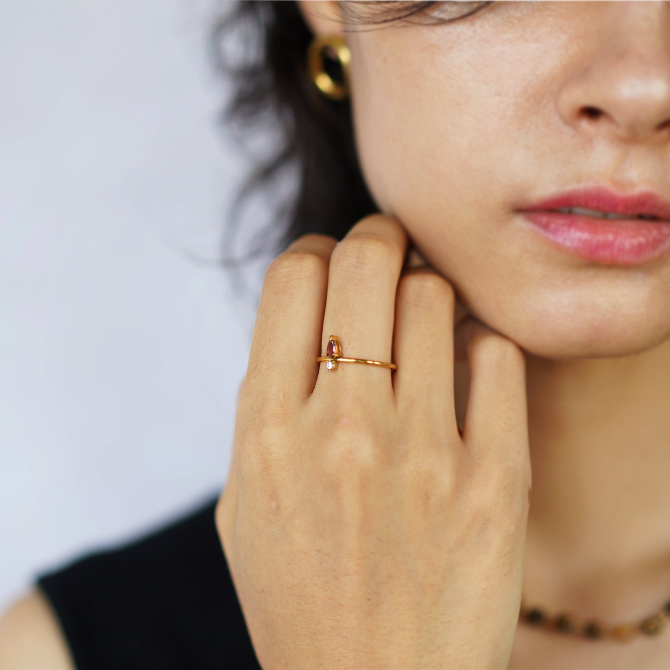 小ぶりなシェイプ(しずく型)のジルコニアと、ラウンドカットのクリアなジルコニアが左右対称にセットされています。深みのある赤褐色のジルコニアと、きらめくジルコニアトーンの異素材の組み合わせが、繊細ながらも目を引くアクセントとなっています。