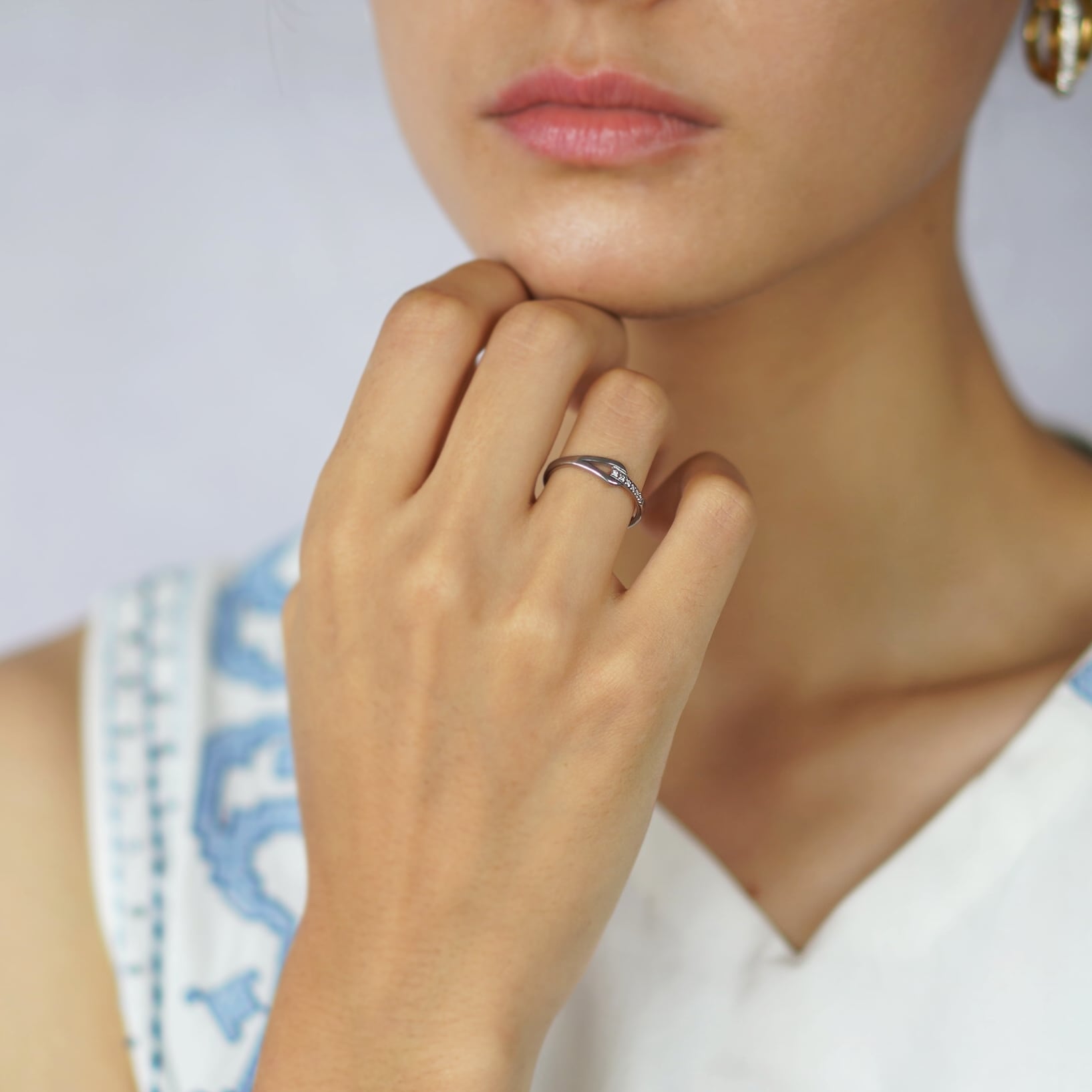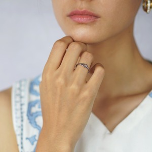 リングのトップ部分では、フープ状の優美なカーブを描いており、ラインに沿って、小さなクリアストーン(ジルコニア)が数粒連なって埋め込まれています。