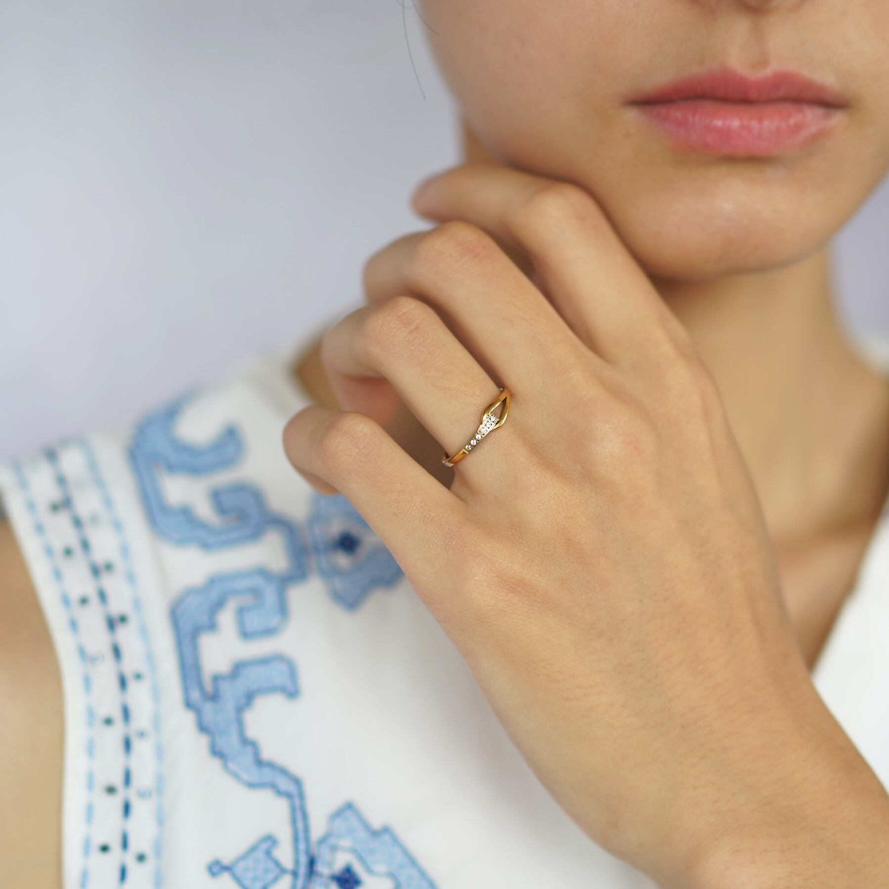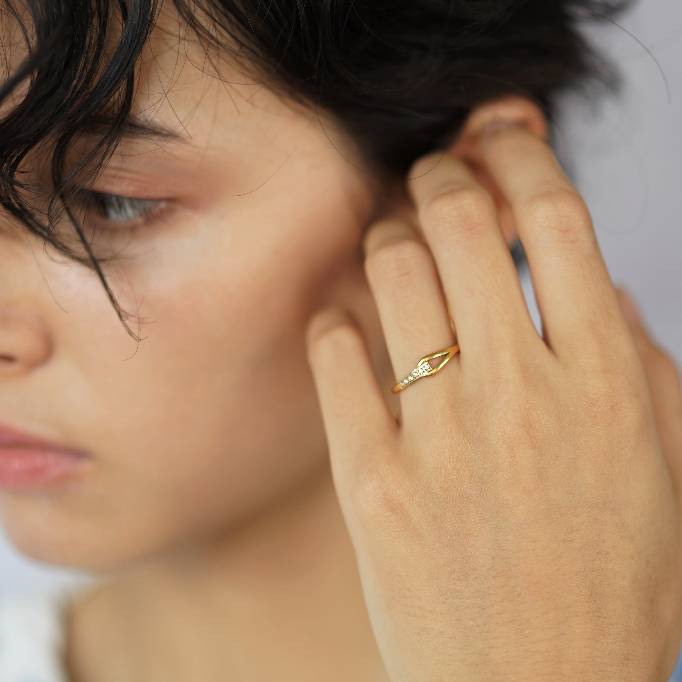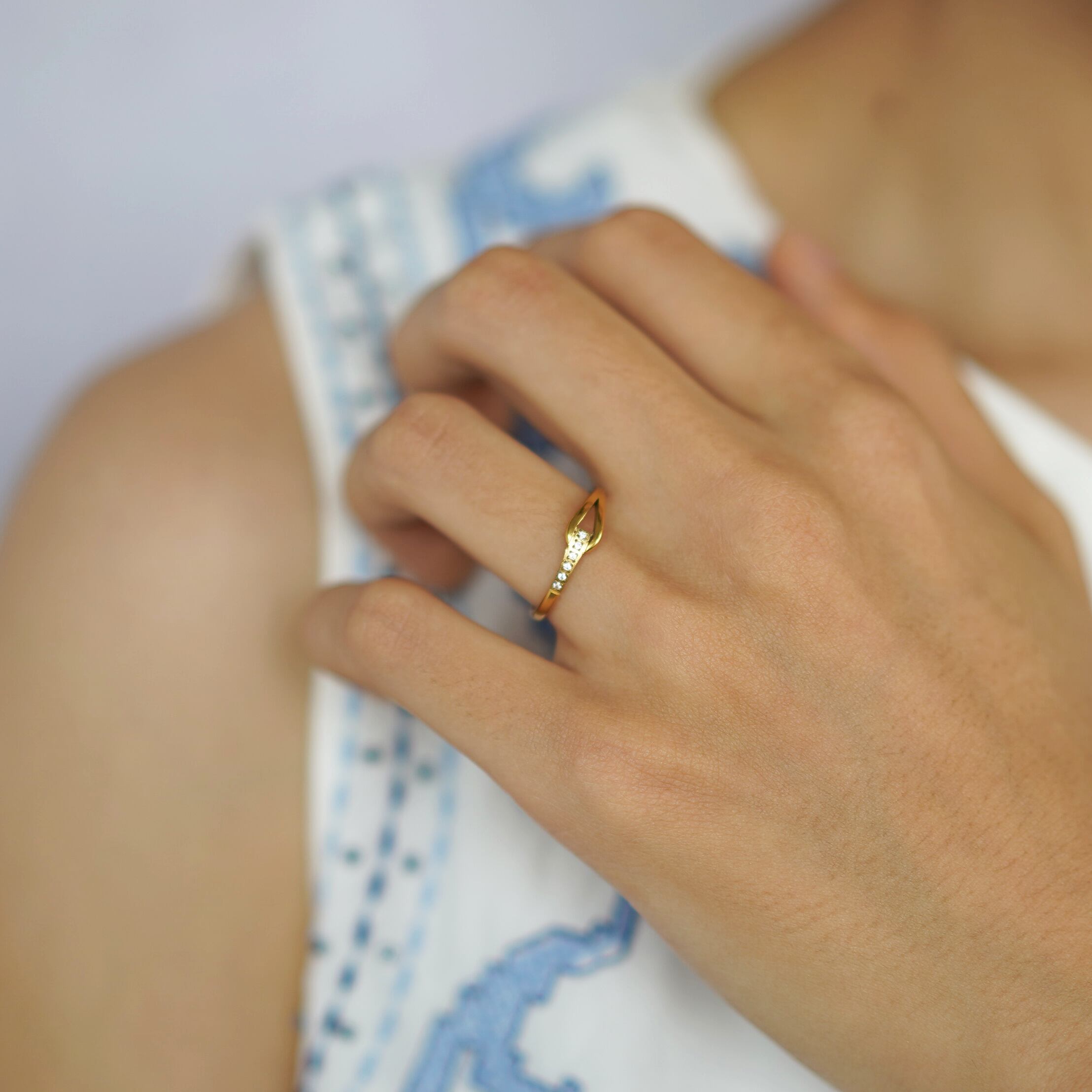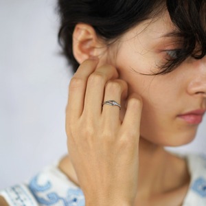中央の柔らかな曲線と、ラインストーンの繊細な輝きが組み合わさり、指元にエレガントでロマンチックな印象を与えます。写真はシルバーとゴールドの着用例があり、重ね着けをしているような立体感があります。