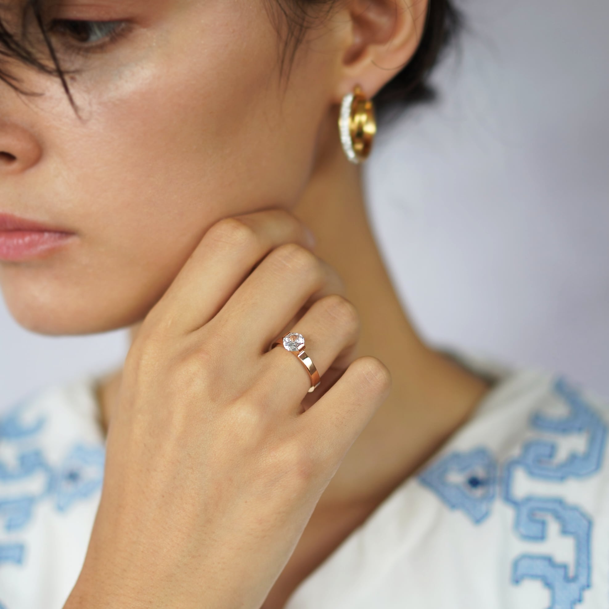 その輝きとボリューム感は、エンゲージメントリングのような華やかさがありつつ、日常使いしやすいデザインに落とし込まれています。