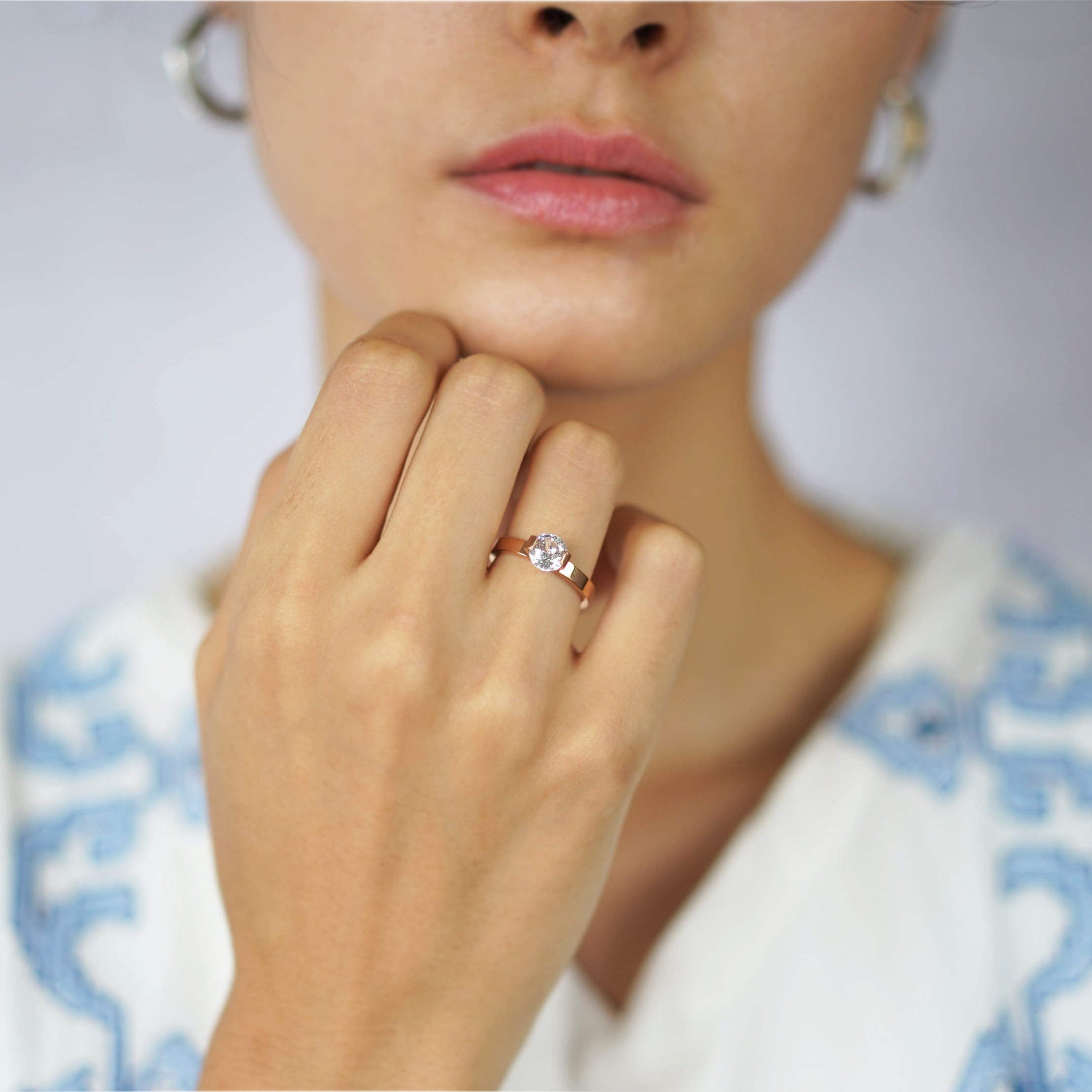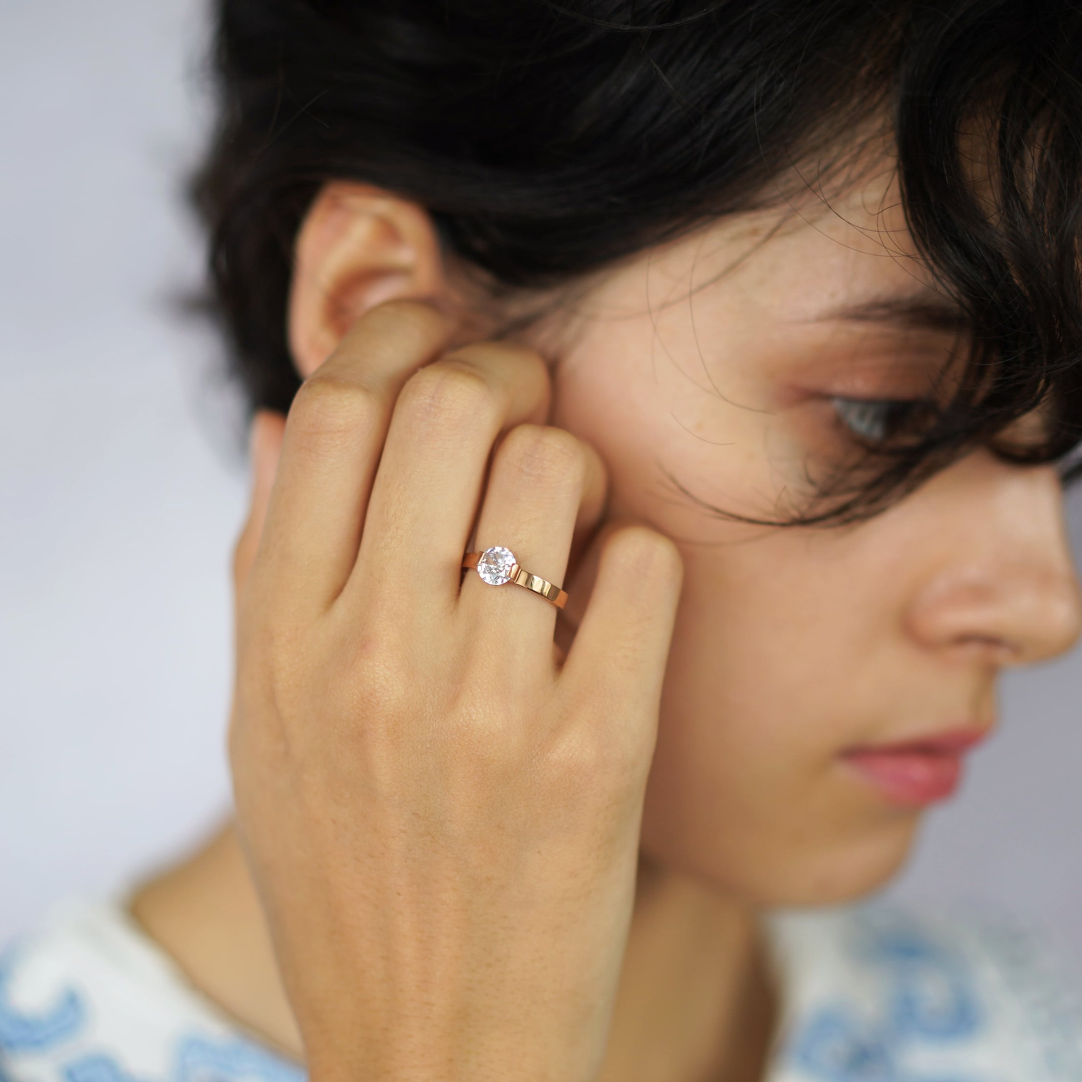 シンプルでモダンな平打ちのアームと、大粒のクリアジルコニアが特徴のソリティアリングです。