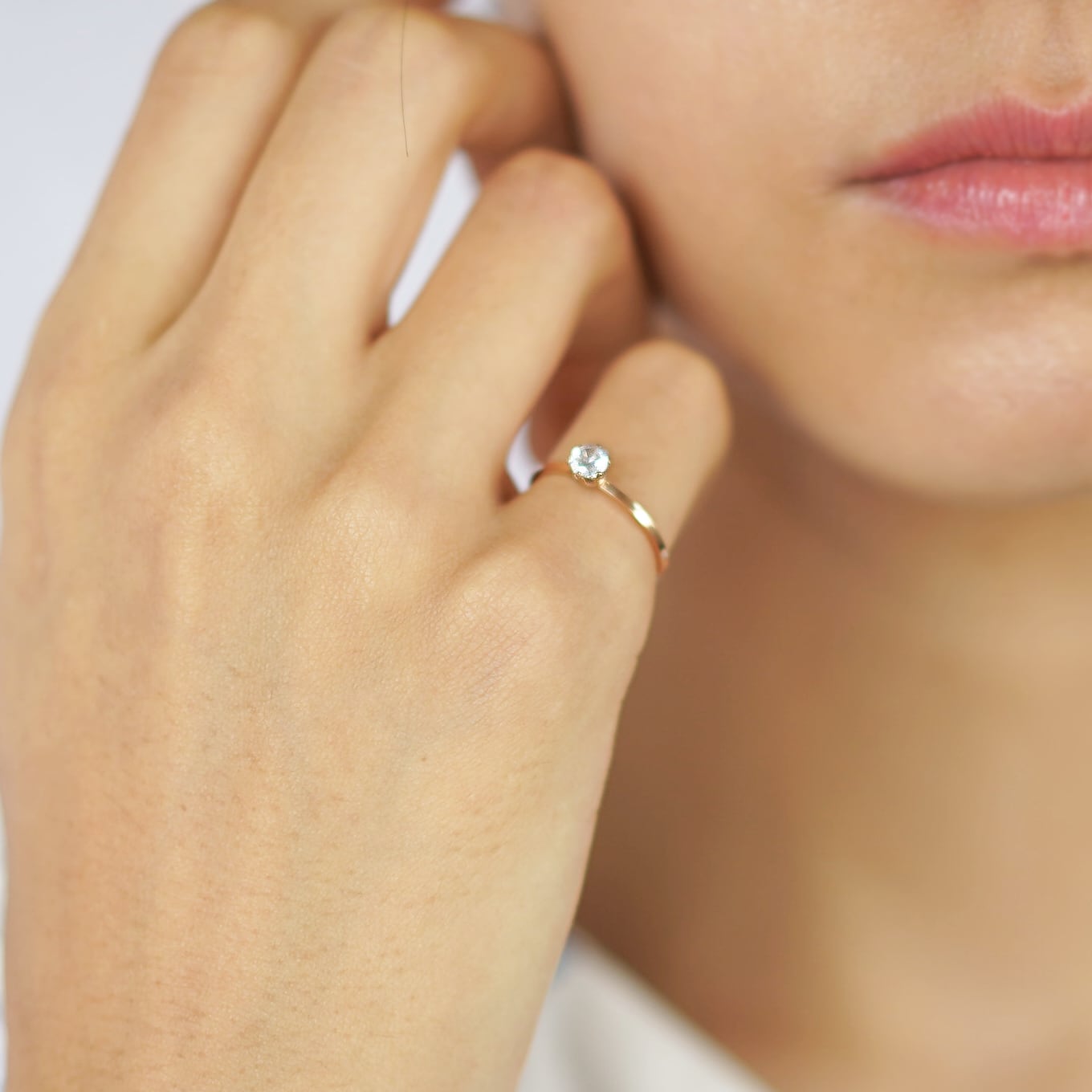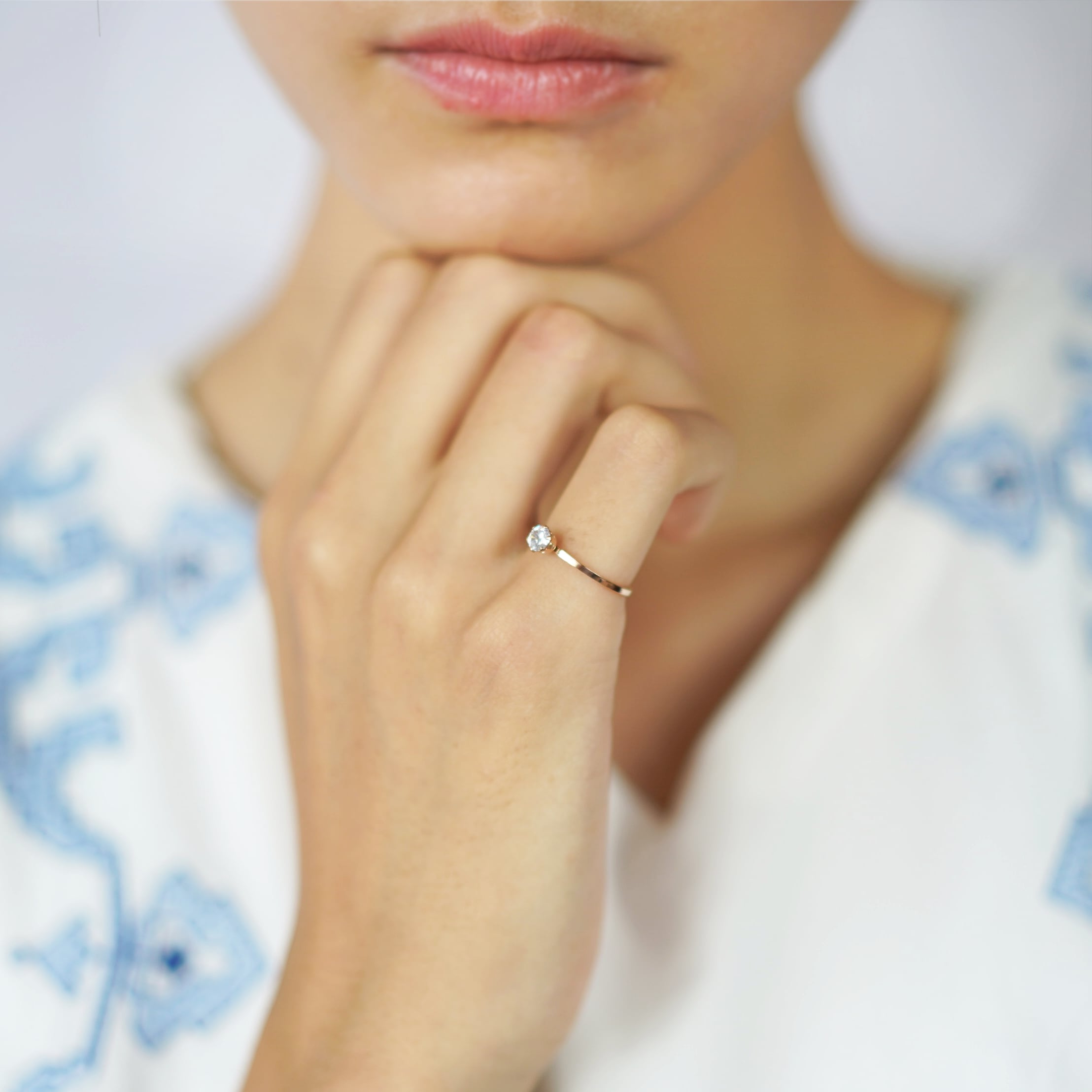 控えめなサイズ感ながら、一粒石のクリアな輝きが指元に上品なアクセントを加えます。単独で着けても、他の華奢なリングと重ねて楽しむのにも最適です。
