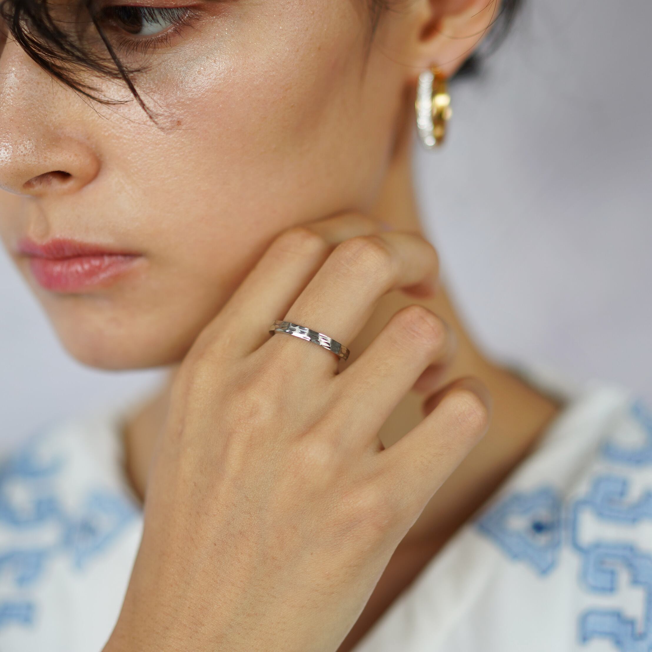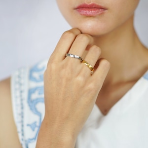 鏡面仕上げのリングとは一線を画す、落ち着いたマットな質感とモダンさが魅力です。写真のように色違いで重ね着けすることで、より個性的な指元を演出できます。