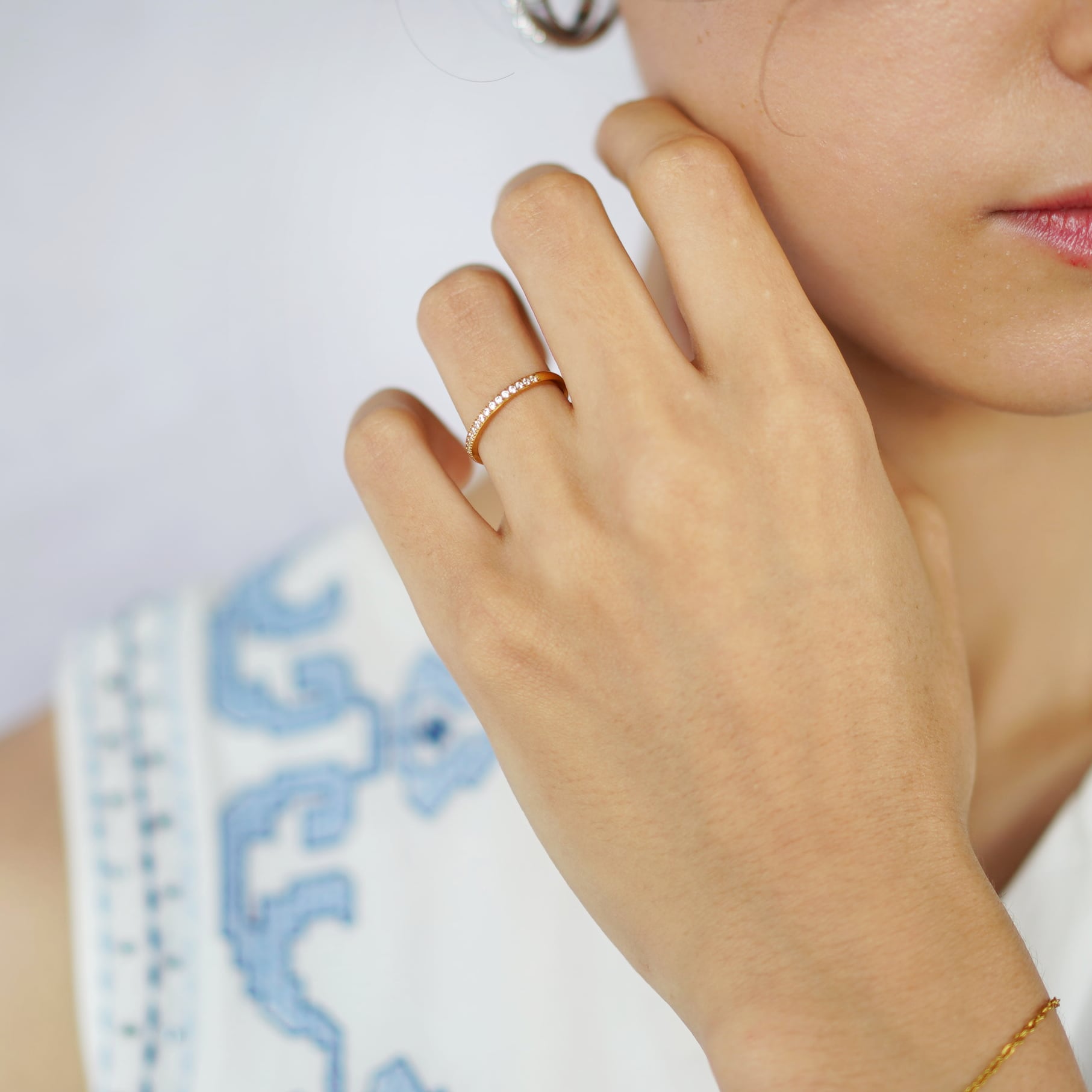 極細のアームに非常に小さなクリアストーン(ジルコニアまたはCZダイヤ)が半周以上にわたって埋め込まれた、華奢なハーフエタニティリングです。