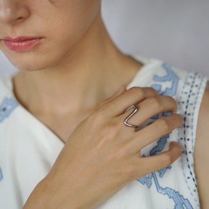 指の上で大きく山なりになるV字に近いS字カーブを描いており、その立体的なフォルムが指元に強い存在感とアートな雰囲気を加えます。
