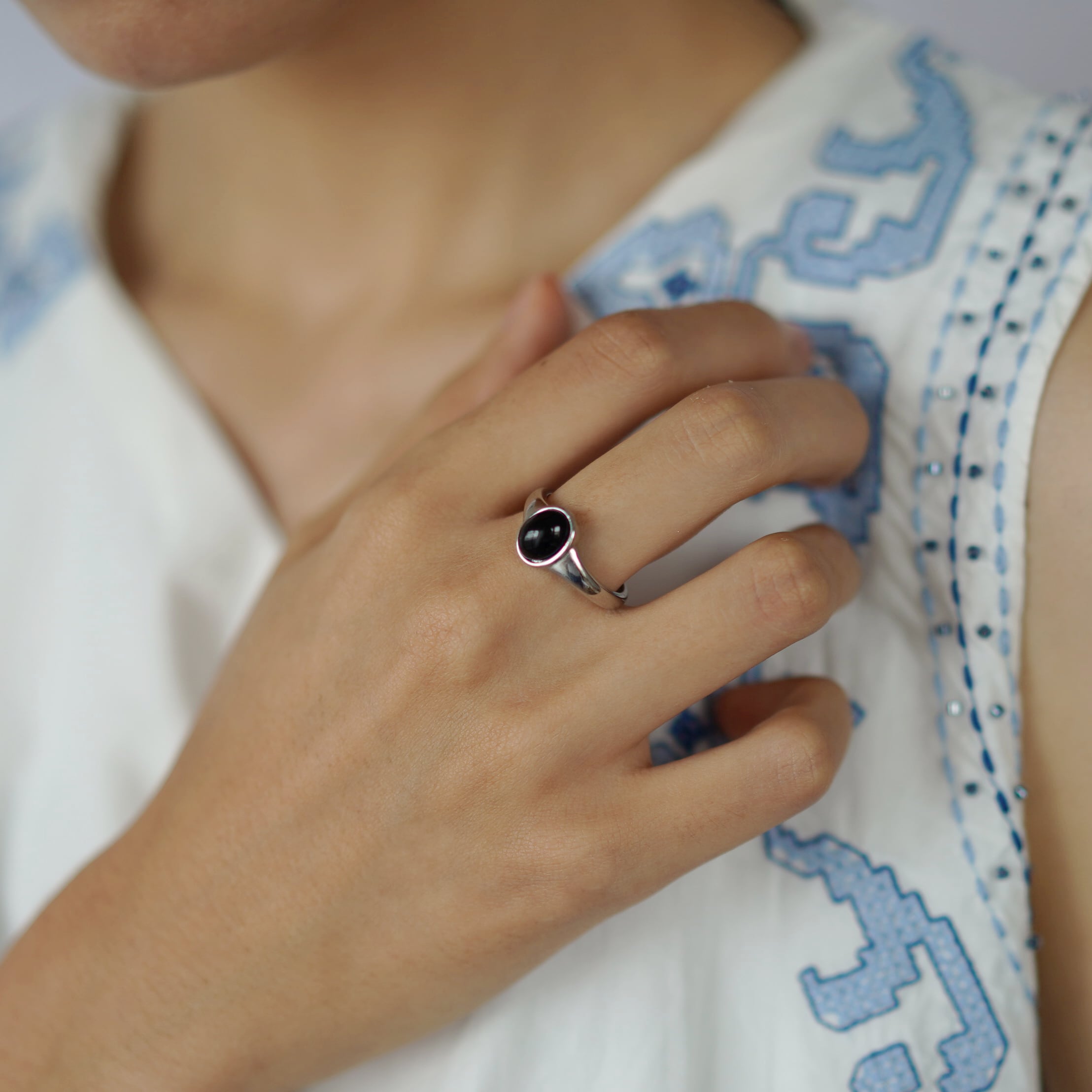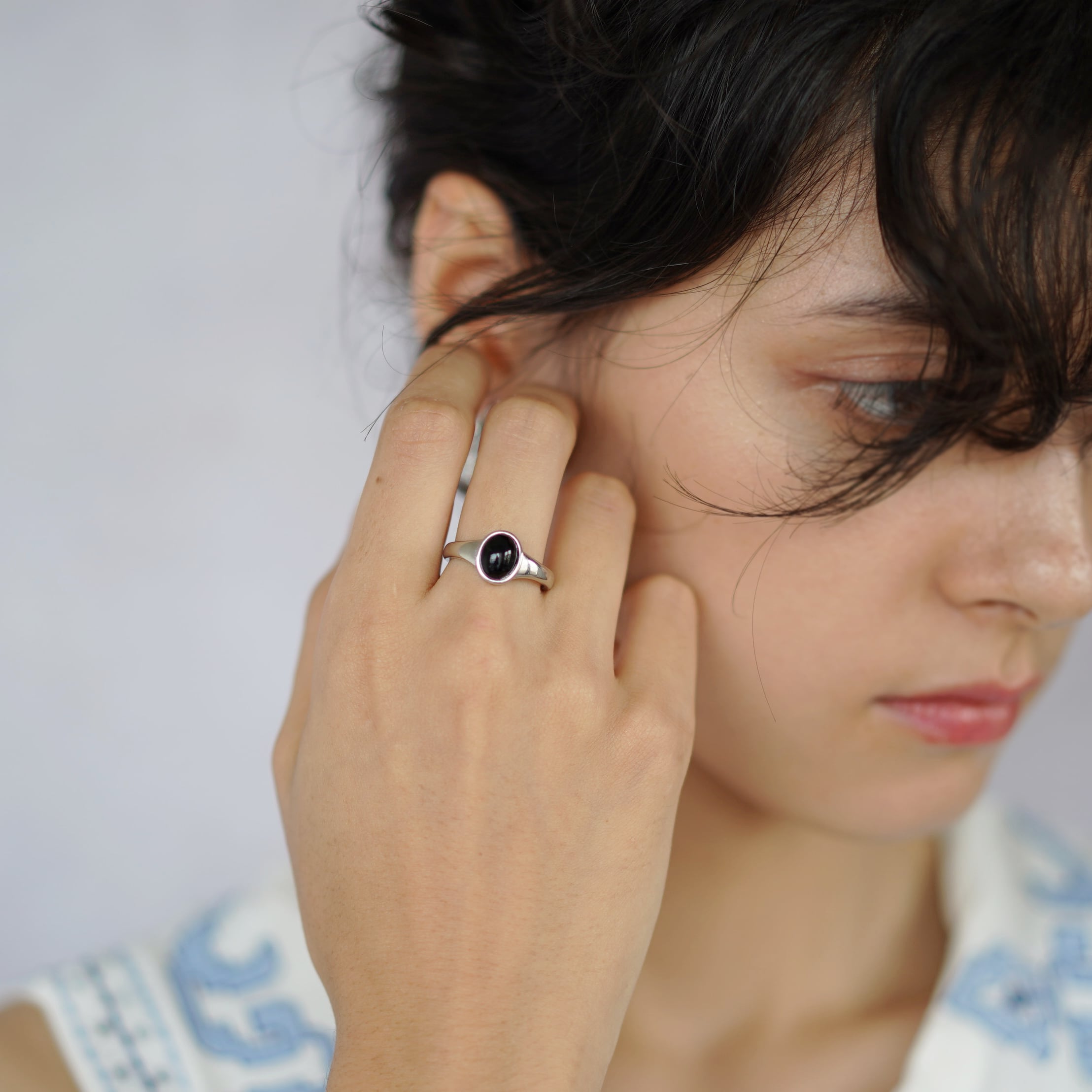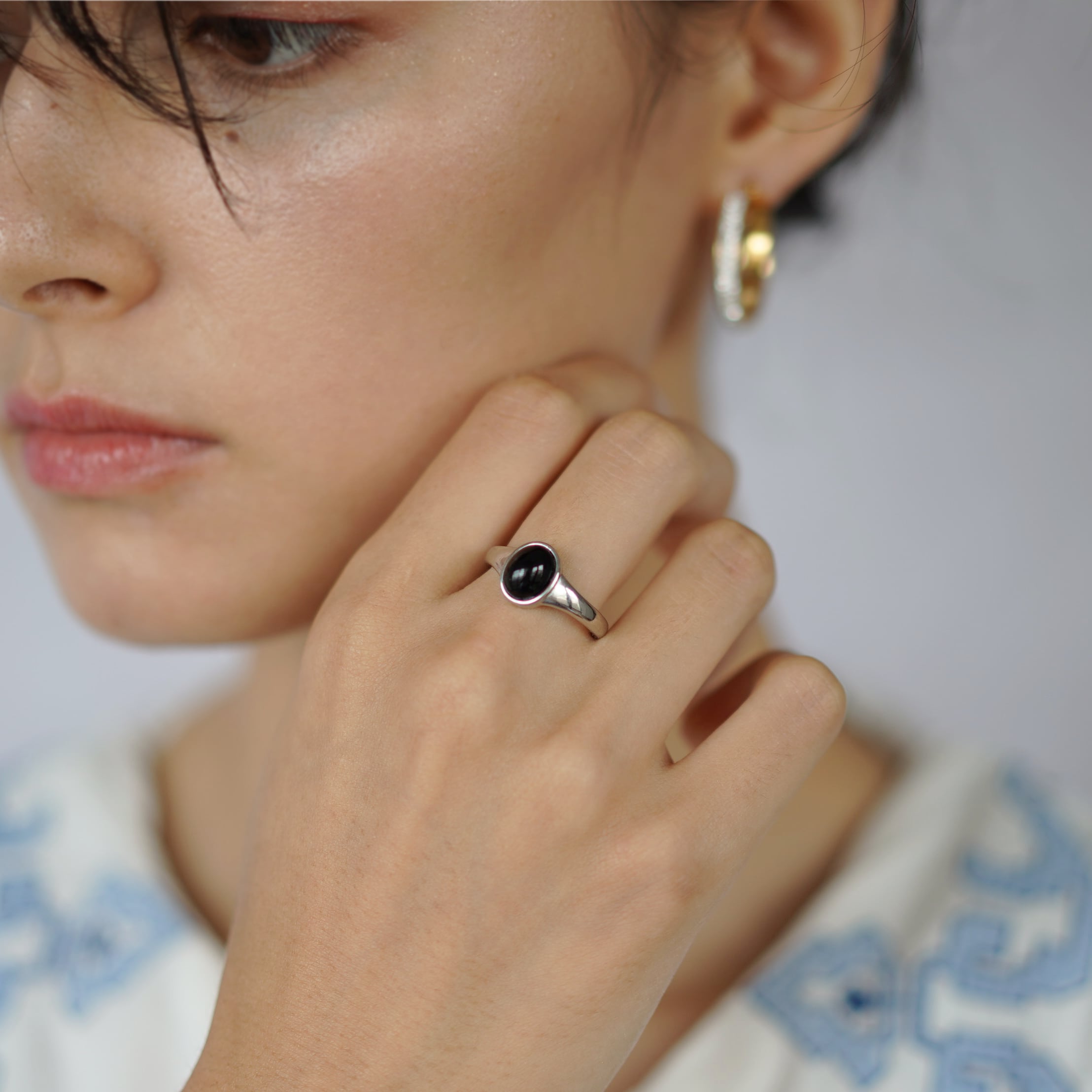オーバル(楕円形または丸みを帯びた長方形)のカボションカットの黒いメノウ(アゲートを中央に配した、クラシックなデザインで石の存在感を際立たせています。