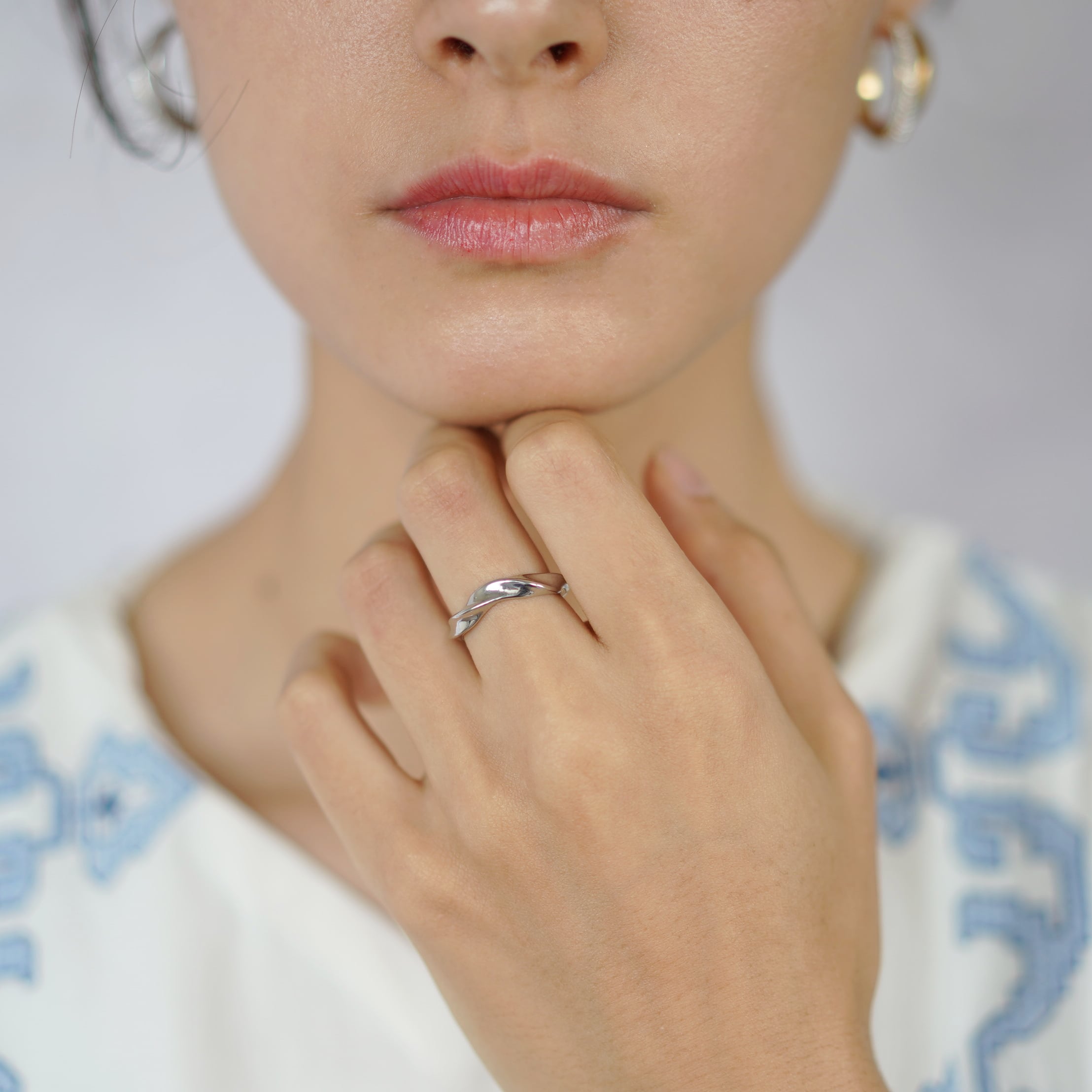 アームは程よいボリューム感で、シルバーメッキの鏡面仕上げにより、なめらかで美しい光沢を放ちます。立体的にツイストしたリングは、指に動きと豊かな表情を与え、シンプルながらも個性的な存在感を演出します。