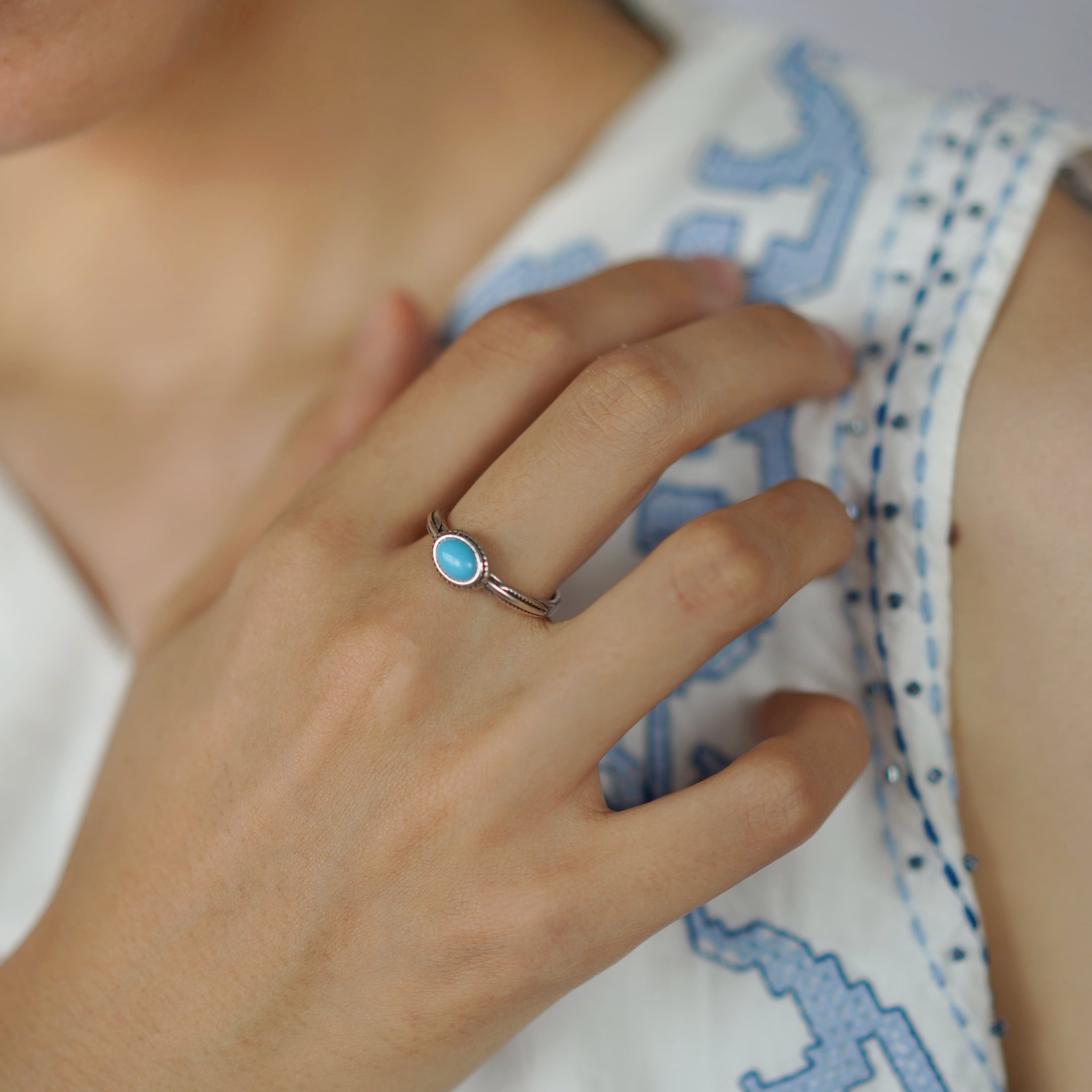 鮮やかなターコイズブルーの石(エナメル樹脂)が特徴のシンプルなデザインのリング。