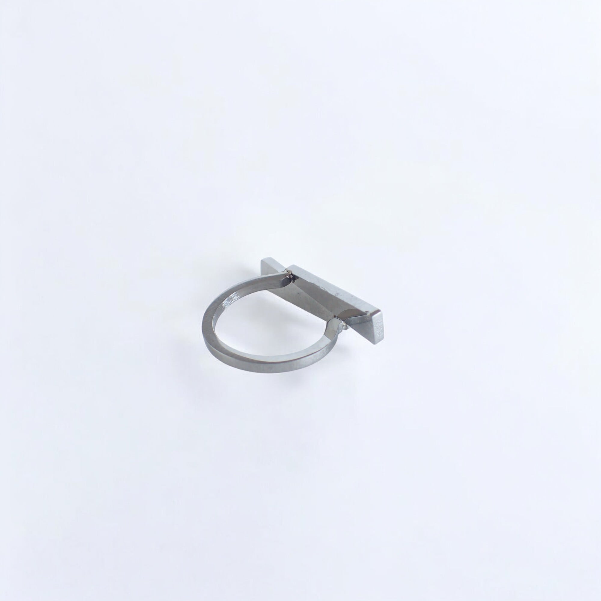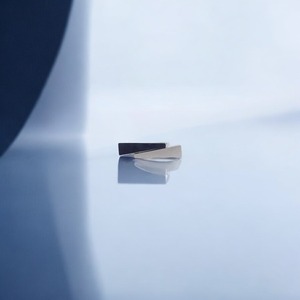 指輪のトップでは、重ねられた2枚のプレートが、指に対して平行に配置されています。プレートの表面は、光の反射と質感のコントラストが際立ちます。
