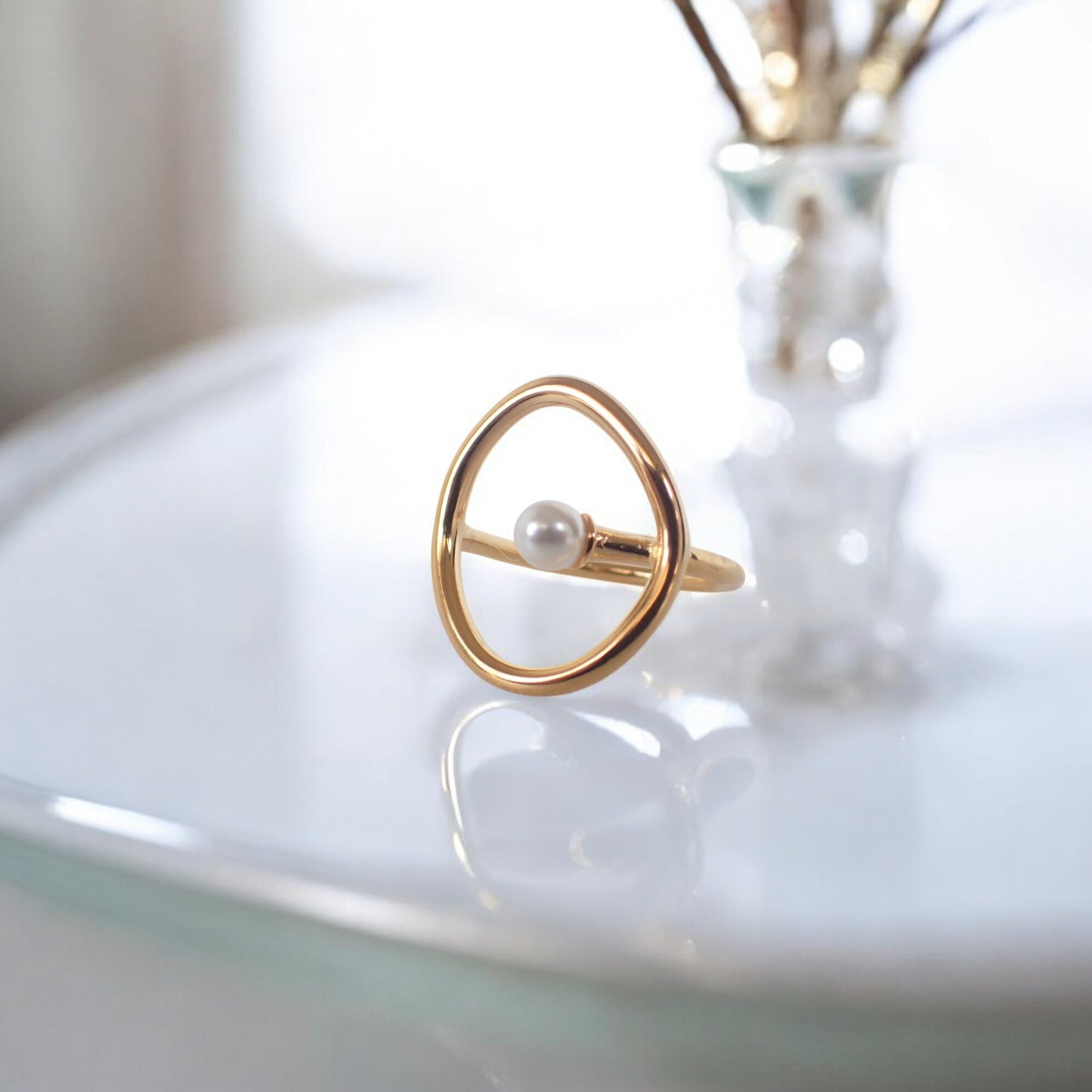 指輪トップに大きな楕円を描き、その中央を細いバーが横切っています。このバーの上に、小さな一粒のパールビーズが浮いているように固定されており、モダンなデザインにクラシックな要素を加えています。