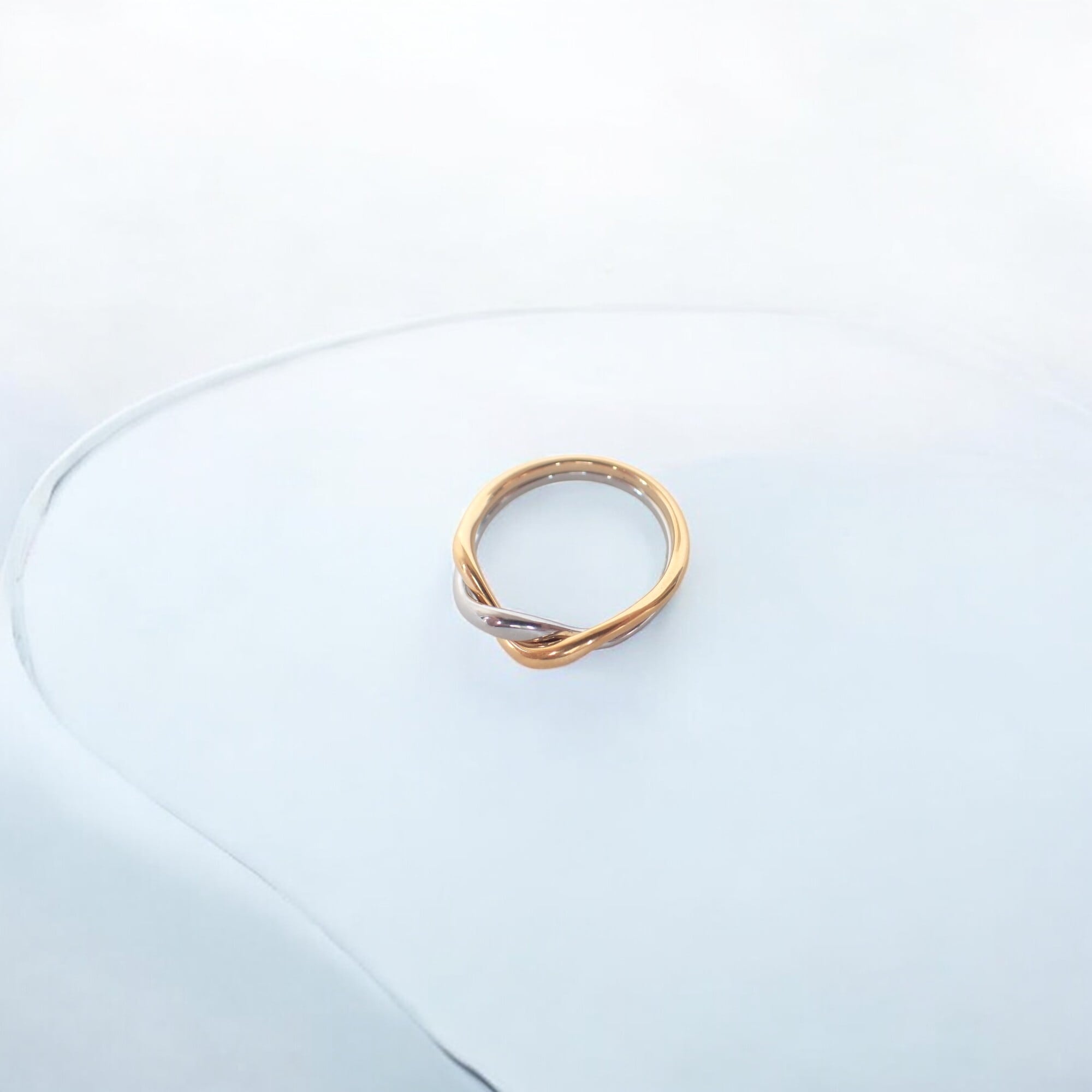 2本のラインは、それぞれ異なる色の地金で仕上げられたバイカラー(コンビカラー)です。ゴールドトーンとシルバートーンのラインが立体的な曲線を描いており、指先に繊細な動きと色のコントラストを与えます。