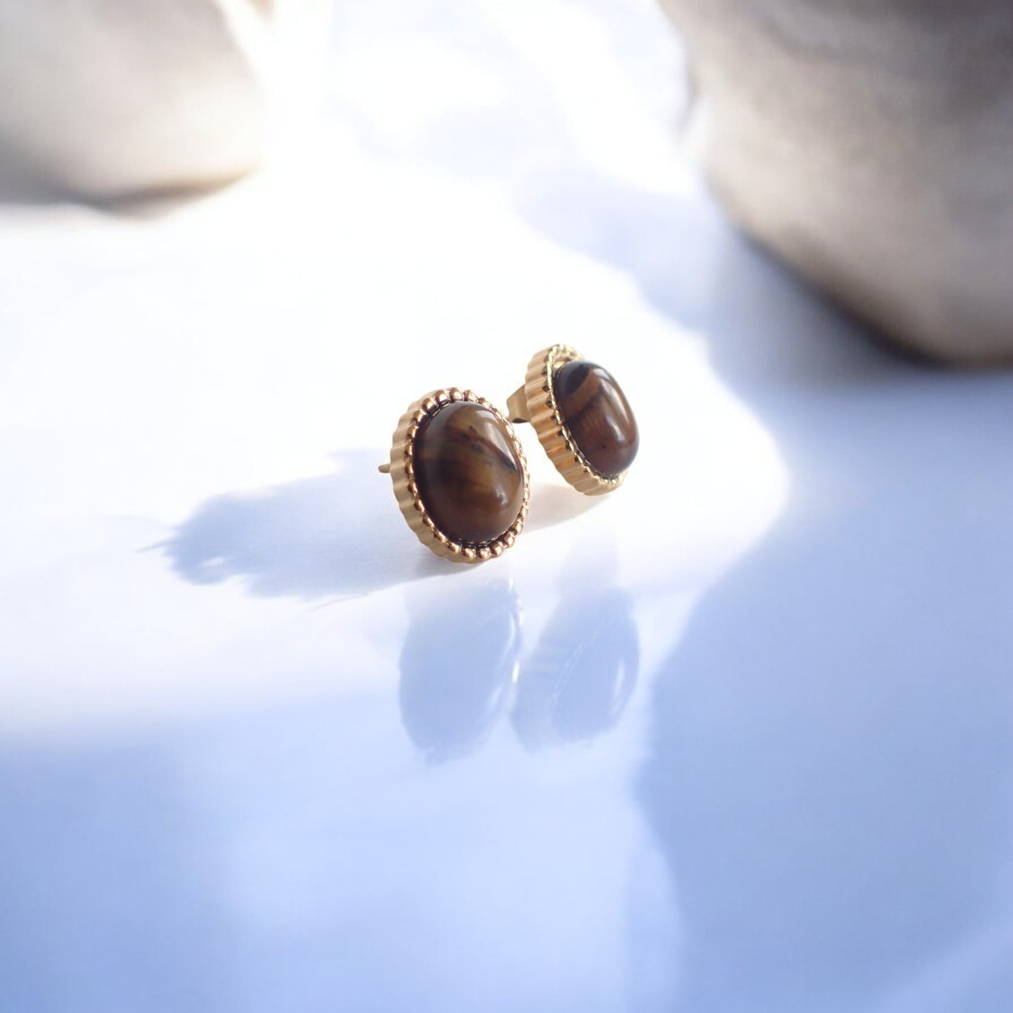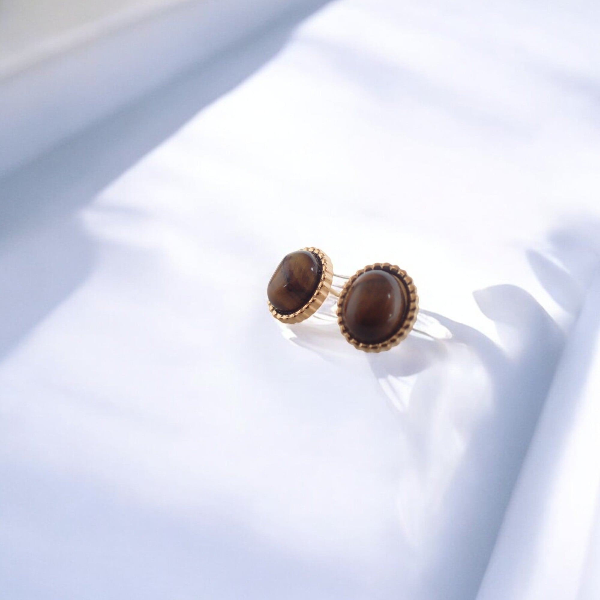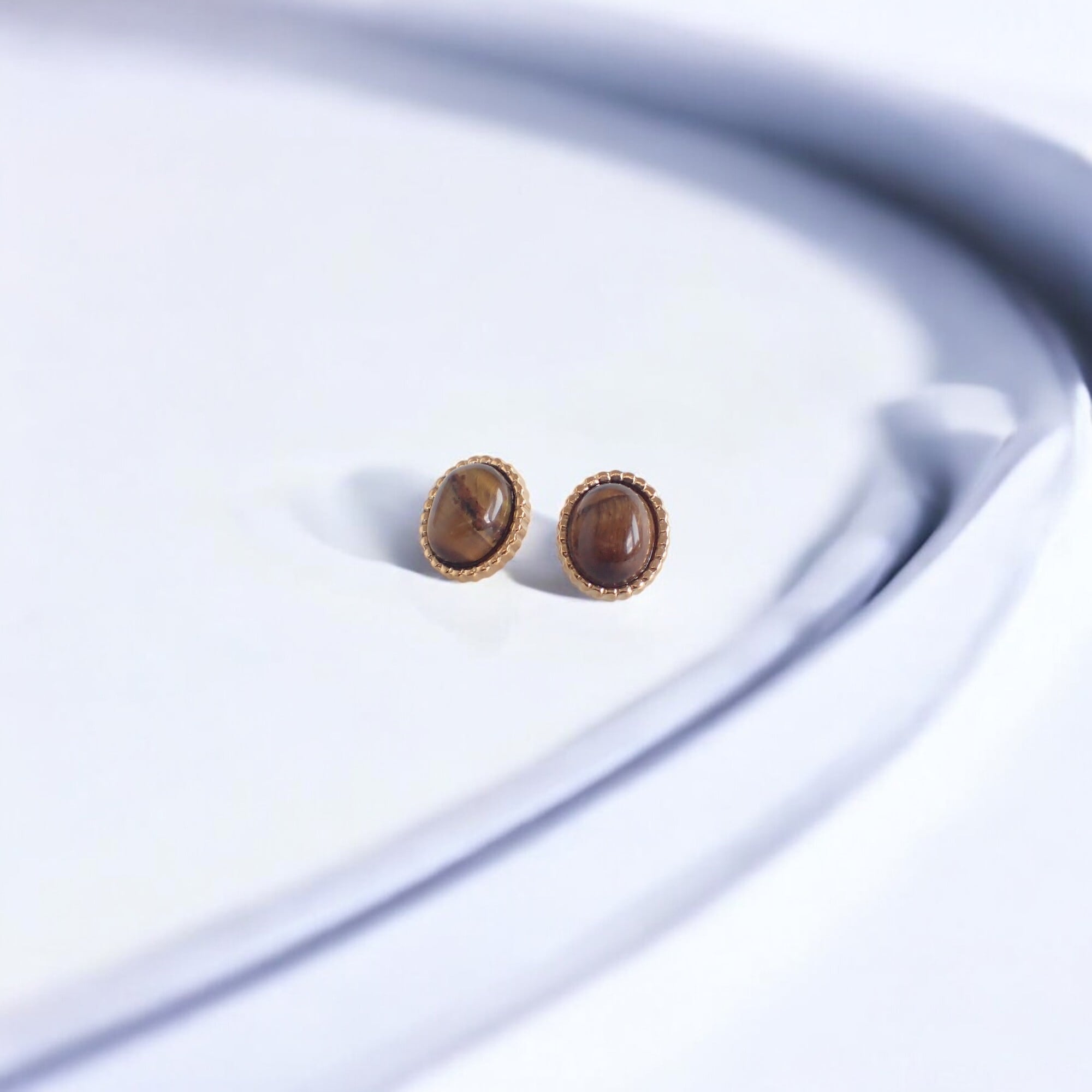 タイガーアイ(トラメ)ストーンを使用した、ゴールドカラーのスタッドピアスです。