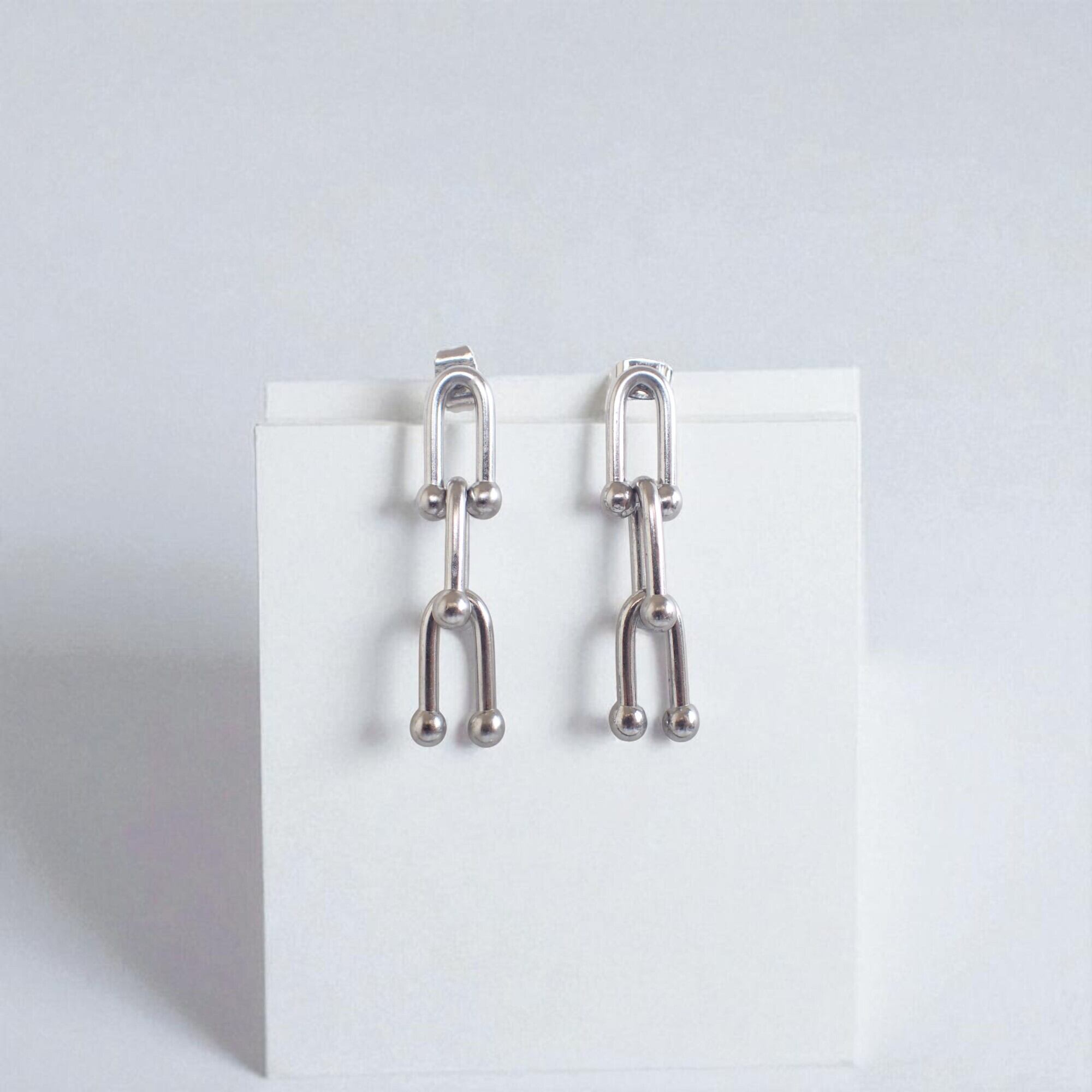 モダンでクリーンな印象を与える、シルバーカラーのU字型リンクドロップピアスです。