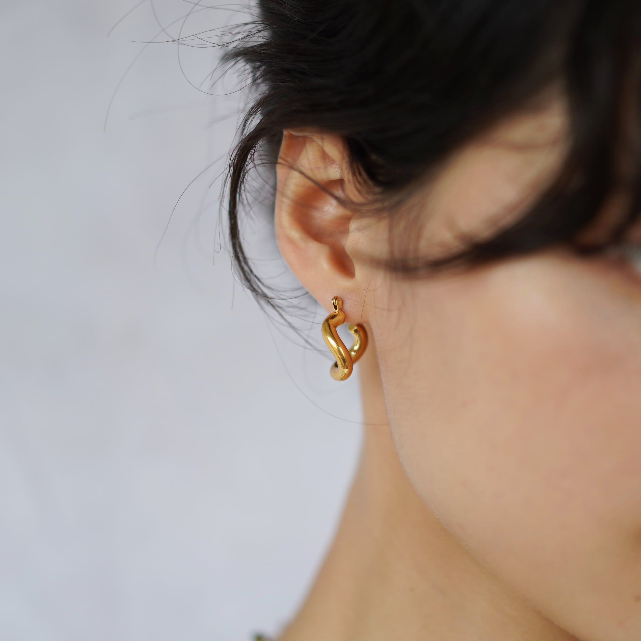 留め具はポストをフープの内部に差し込む一体型のデザインで、後ろ姿もすっきりとしています。