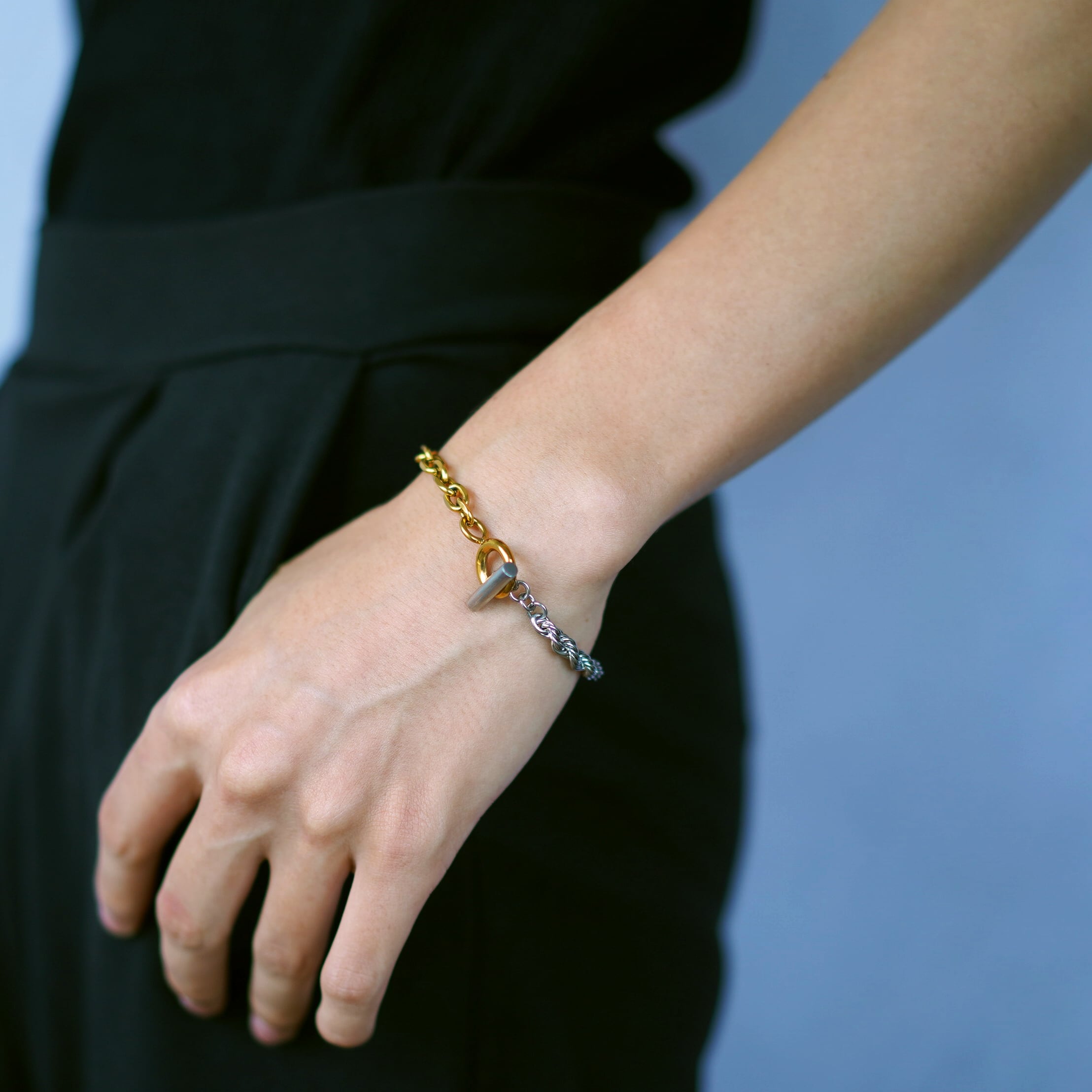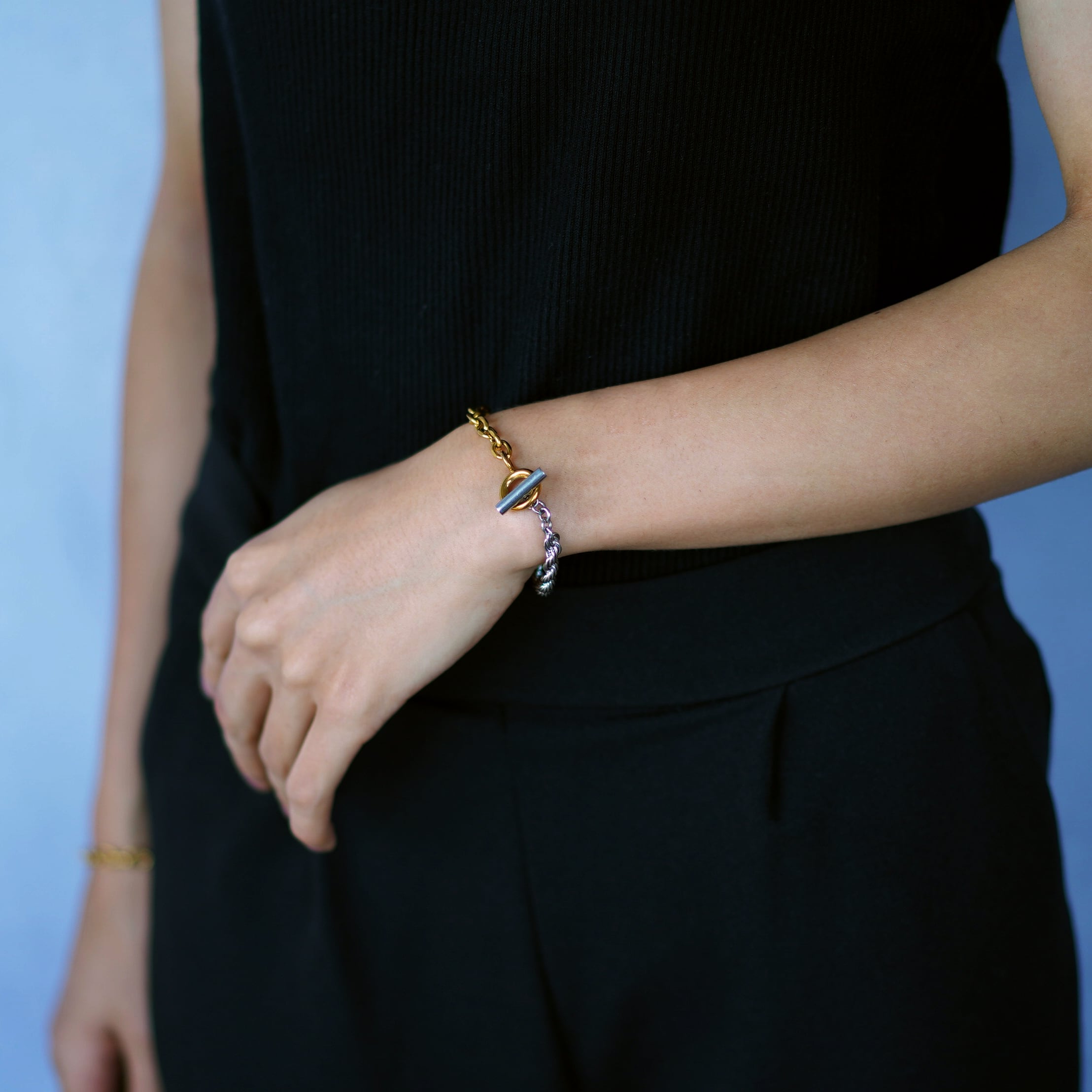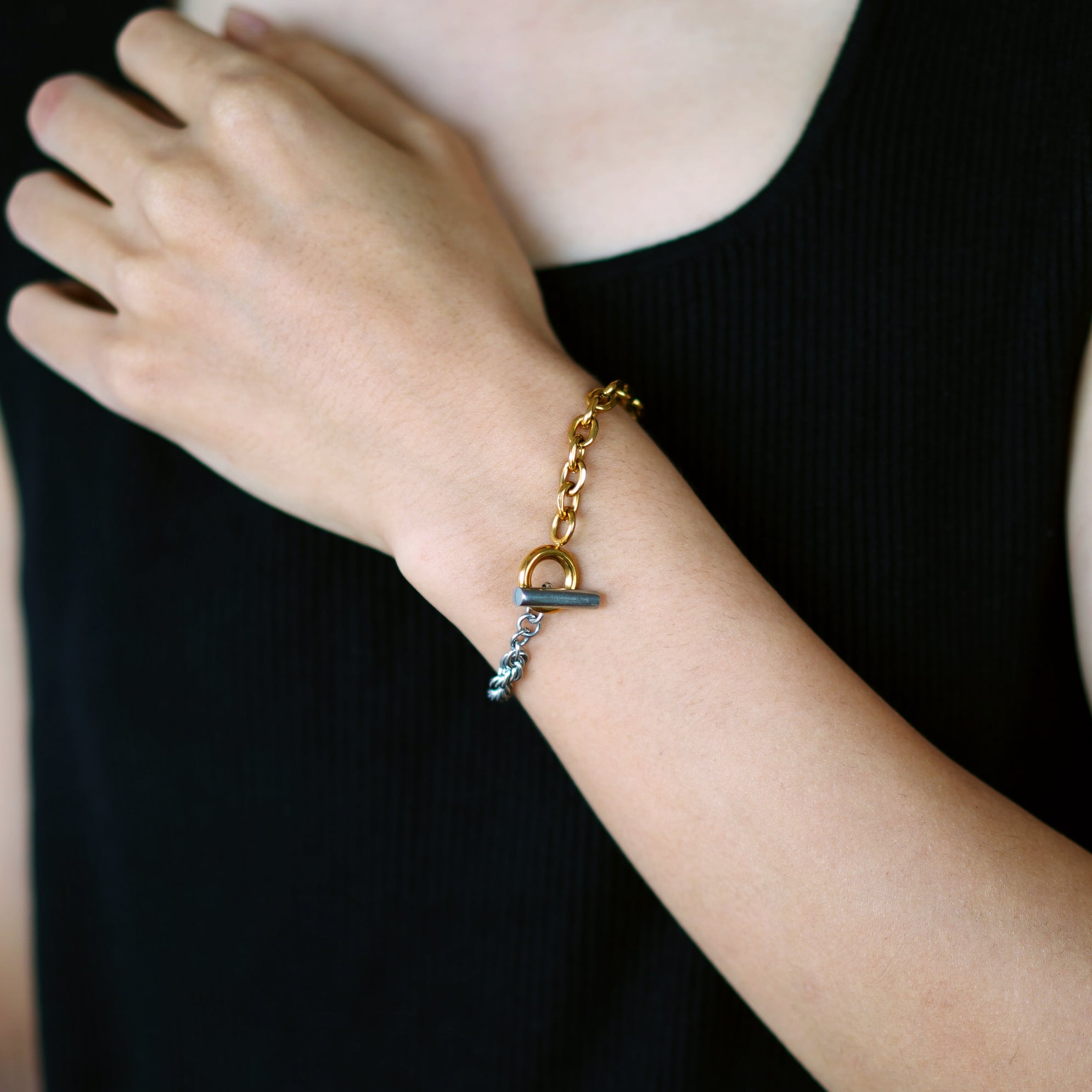 チェーンの一部がゴールドとシルバー(で切り替えられた、バイカラーデザインのブレスレットです。