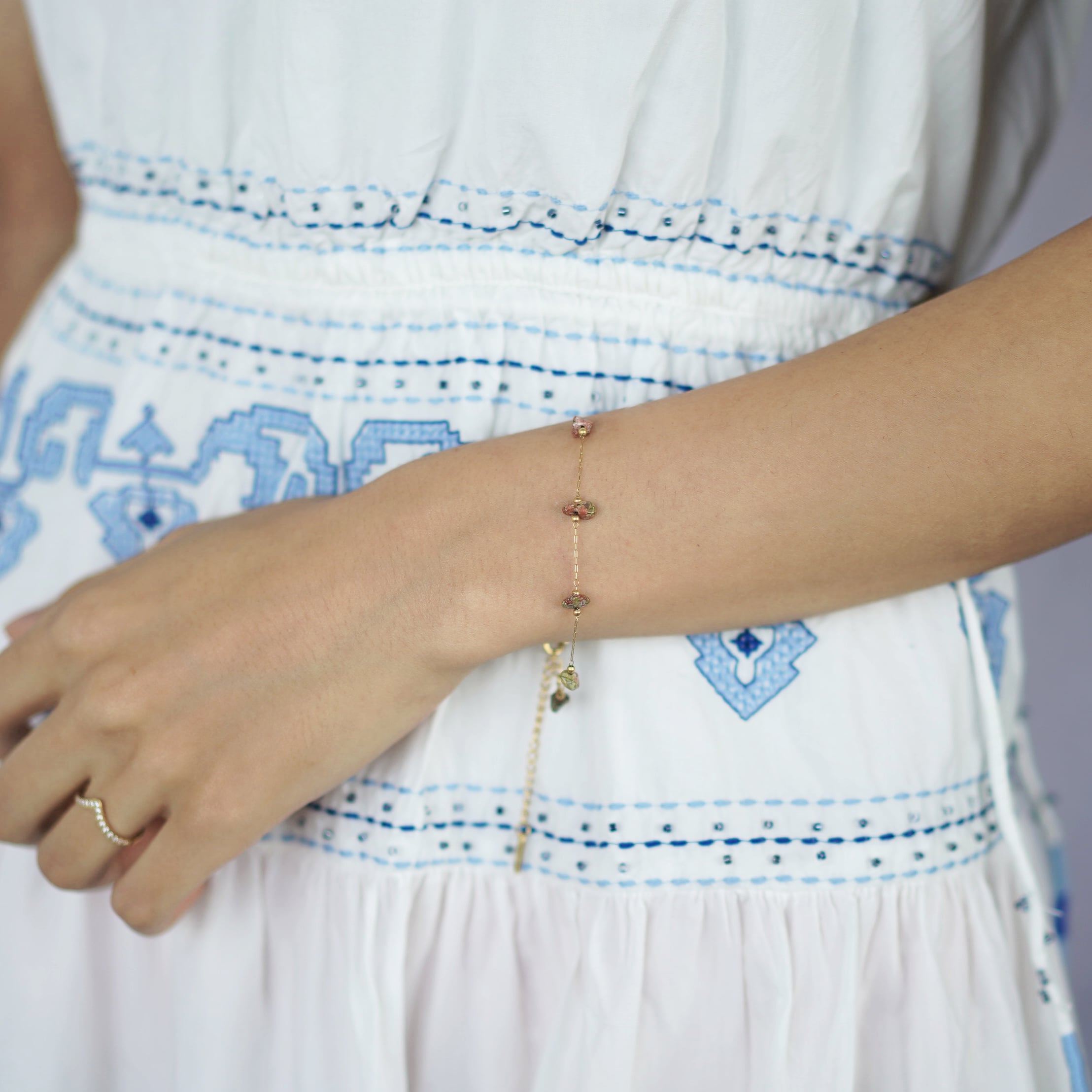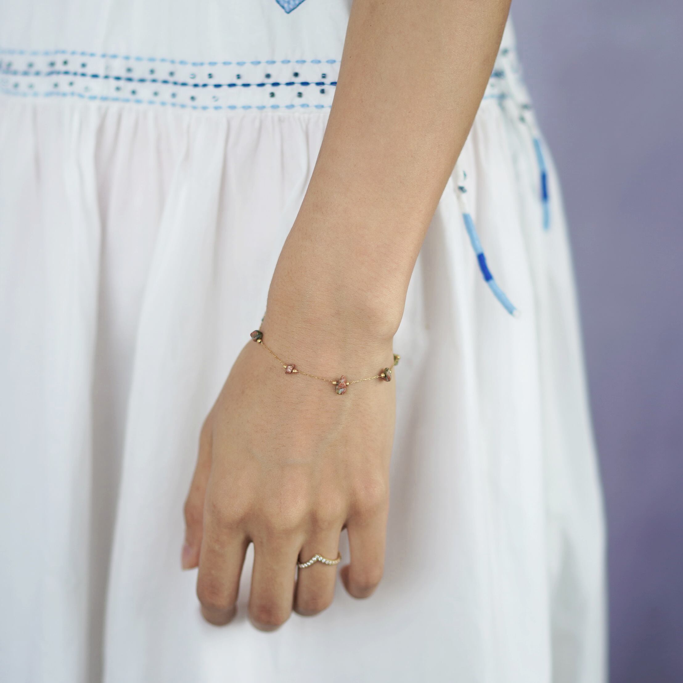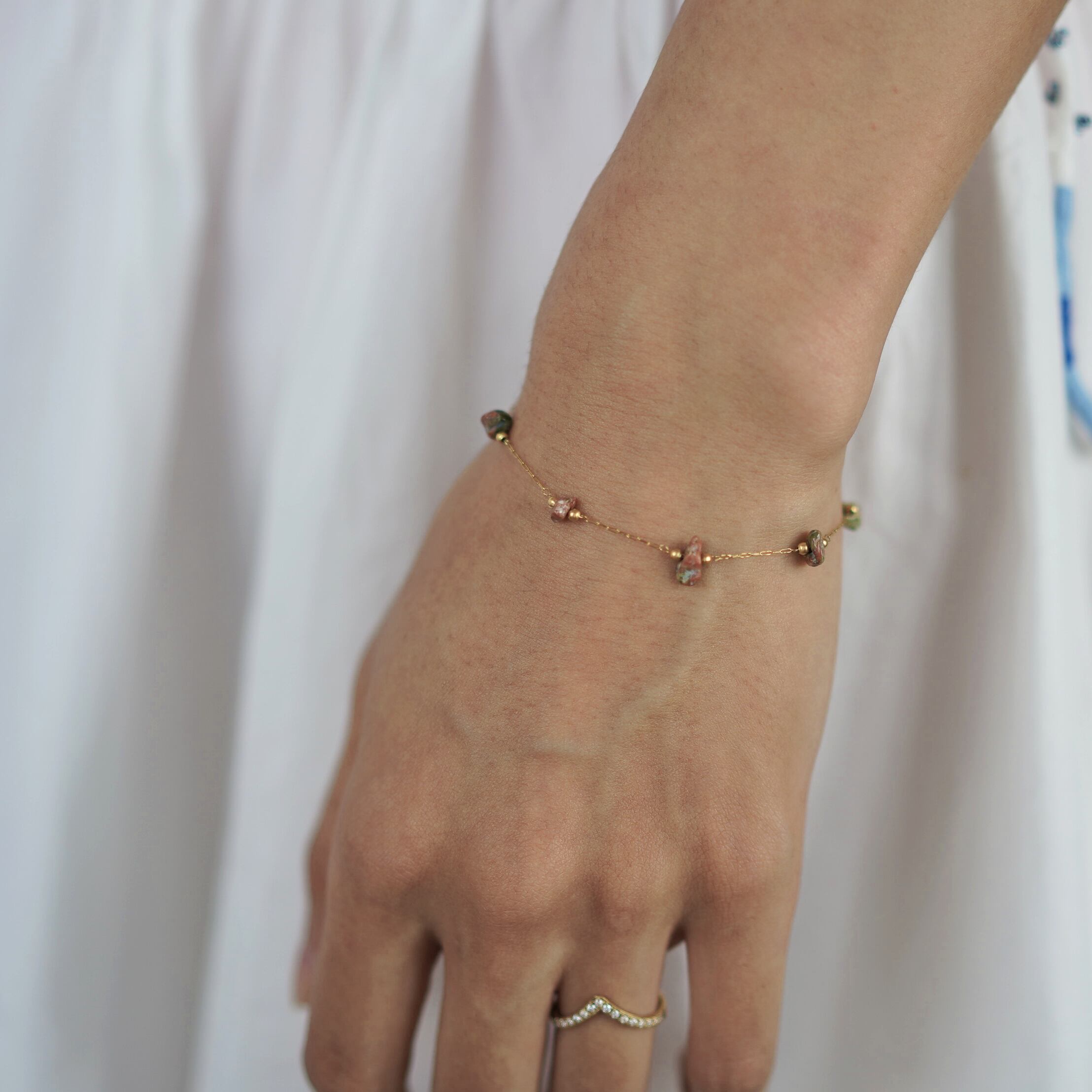 天然石は不揃いな形が特徴で、光の当たり方によって様々な色合いに輝き、手首に華奢で上品なアクセントを添えます。