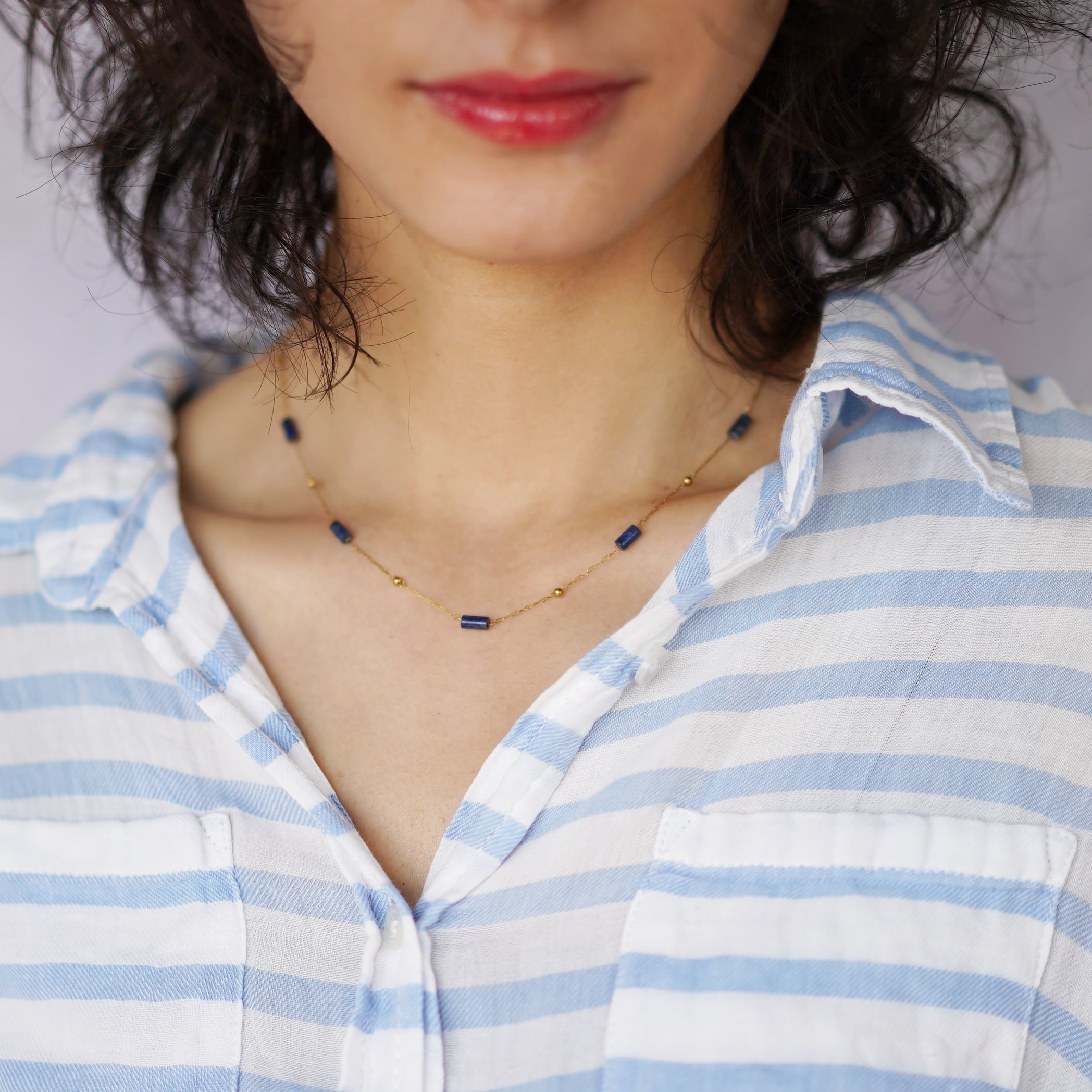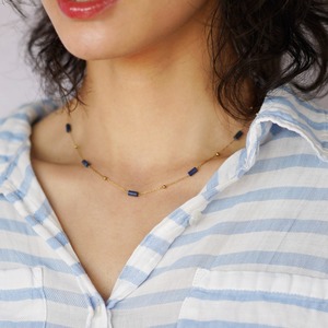 深みのある青が美しいラピスラズリを、直方体に整えたビーズとして繊細なゴールドチェーンに配置しました。