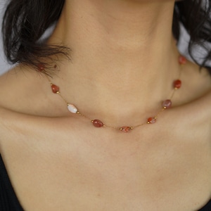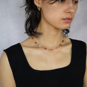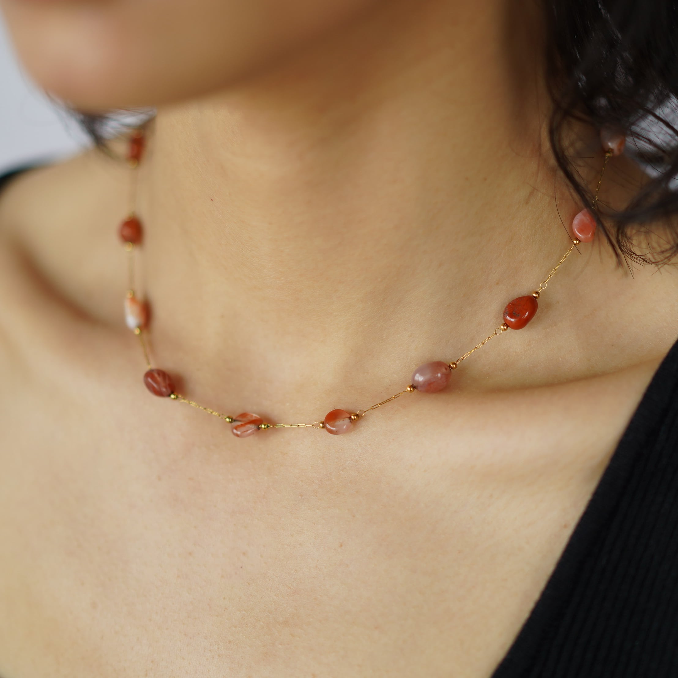 落ち着いたオレンジピンクの瑪瑙ビーズを、不揃いな形のまま均等に並べたネックレスです。