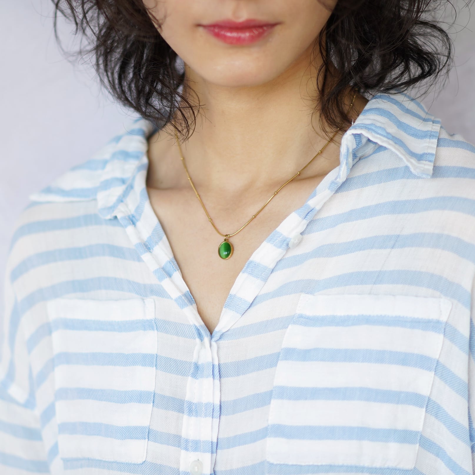 艶やかなグリーンのキャッツアイをオーバル型に整え、ゴールドの縁で包んだペンダントネックレスです。