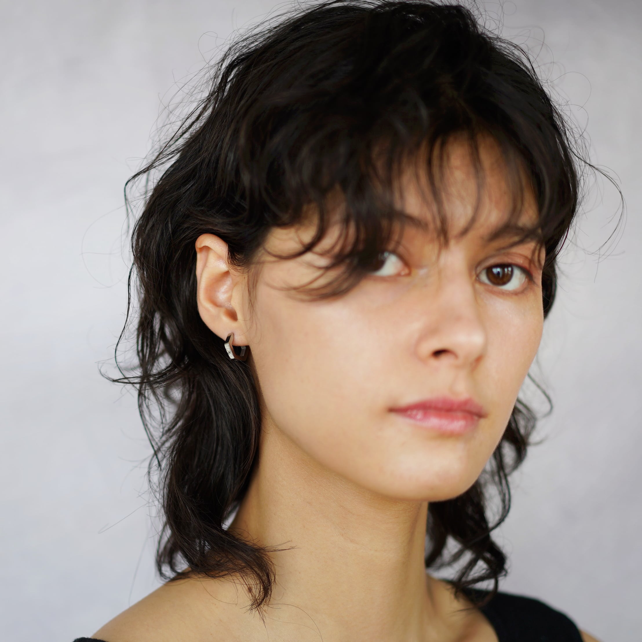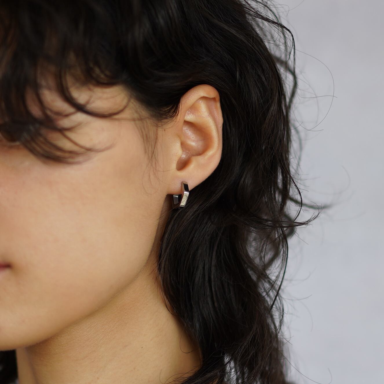 幾何学的なデザインが個性的なフープピアス。小ぶりなのでつけっぱなしもOK。