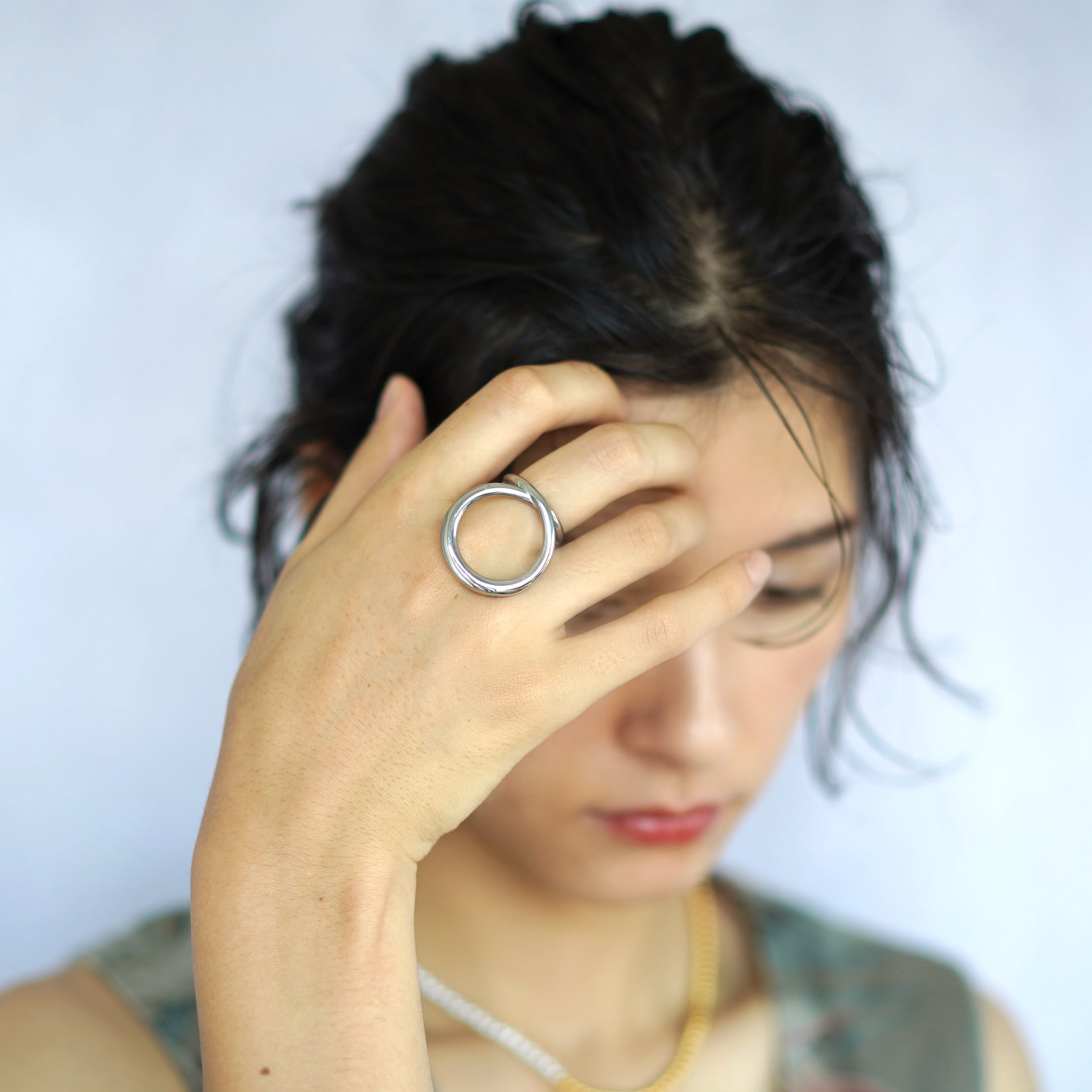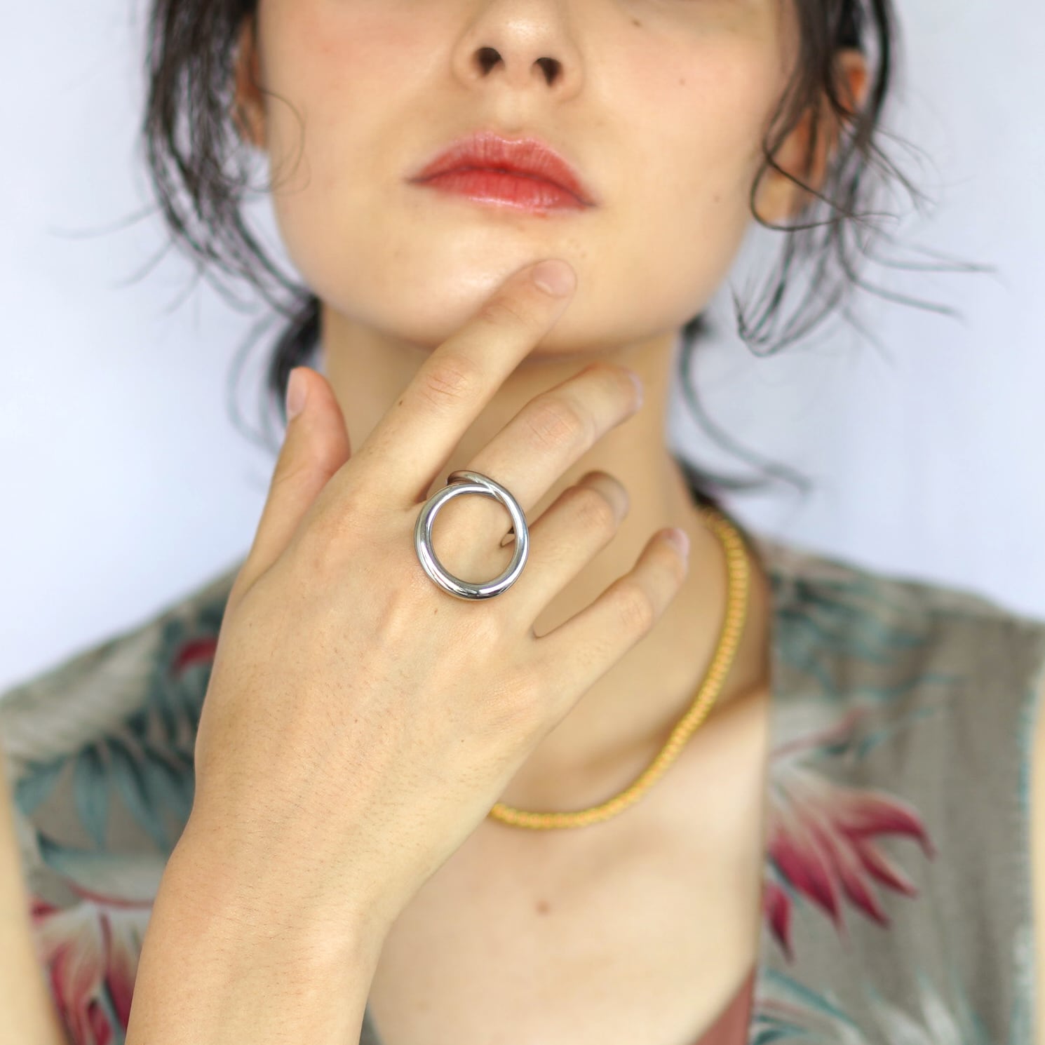 モノクロの服装に合わせることで、リングの美しさが際立ちます。黒のスリムフィットドレスや白のシルクブラウスと組み合わせると、リングがアクセントとして、洗練された印象を与えるでしょう。